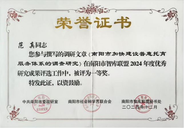 校党委副书记、校长范真领衔的智库研究成果《南阳市加快建设普惠托育服务体系的调查研究》荣获2024年度南阳市智库研究一等奖,报告被市委政策研究室《决策参阅》全文刊发。范真团队聚焦系统破解“幼有所育”民生难题,深入调研南阳市托育服务发展现状,系统剖析区域发展不均衡、师资力量薄弱、行业标准缺失等痛点,提出“强化顶层设计、完善人才队伍、构建多元供给体系”等多项创新对策。该研究立足国家生育支持政策导向,融合上海、广州等地“社区嵌入式托育”“公建民营”等模式和国外经验,建议通过设立专项基金、推动校企联合育人、建立智慧监管平台等举措破解发展瓶颈。此外,科研处孟娅琪老师《加强中医药行业高能级科创平台构建助力南阳建设中医药发展先行区》的研究获评三等奖。