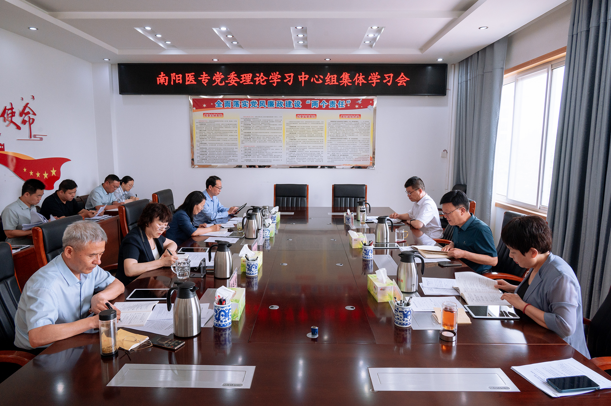 本网讯(文/宣传部 逯扬)5月30日,南阳医专党委理论学习中心组举行集体学习研讨,深入学习习近平总书记考察河南时的重要讲话精神,以及中央八项规定及其实施细则精神,旨在进一步深化思想认识、强化责任担当,为学校高质量发展、高效能治理提供坚强保障。校党委书记柳明伟主持会议并讲话。