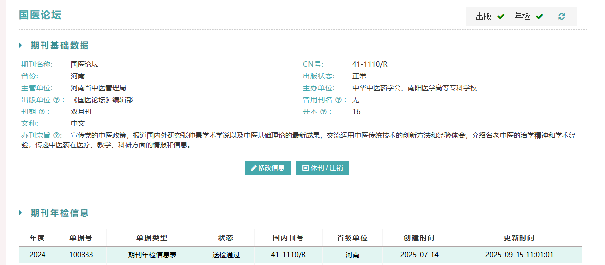 本网讯(文/国医论坛编辑部 魏怡晨)近日,我校《国医论坛》期刊顺利通过2024年度期刊重点抽检,在国家新闻出版总署期刊出版单位年度核验平台公示审核结果为“送检通过”。此次审核是对期刊出版状态、内容质量、编校质量、经营规范及主管主办单位履职情况的全面检验。