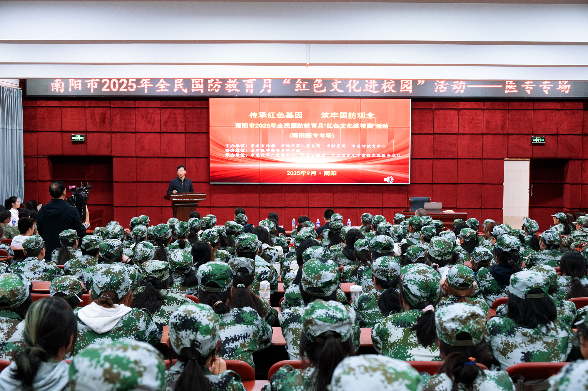 本网讯(文/学生处 皇甫乐观)9月23日下午,南阳市退役军人事务局与我校联合主办的“红色文化进校园”活动在我校举行。活动以“传承红色基因 筑牢国防观念”为主题,是南阳市2025年全民国防教育月活动之一。市退役军人事务局党组成员、副局长孔令金,市国防教育中心副主任马黎,市退役军人事务局机关党委专职副书记张海山,南阳医专副校长王岩出席。学校相关部门负责同志、师生代表参加。活动特邀市退役军人事务局红色教育宣讲团马秀华等8名成员。