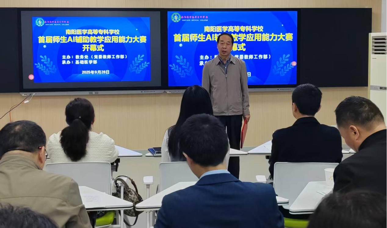 刘荣志致辞,他指出,各位教师要以此次比赛为起点,促进“AI”赋能教育教学,把智能技术向基础学科延伸、向临床专业拓展、向医技药护领域覆盖,让每一次技术跃迁都转化为教学质量的提升,都转化为同学们成长的获得感和幸福感!