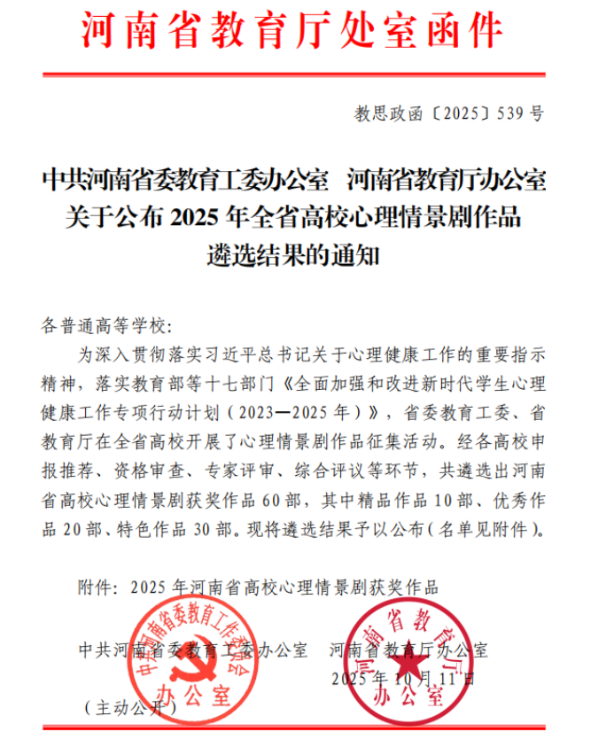 本网讯(文/心理健康关爱与教育中心 李孟辉)近日,河南省教育厅公布了全省高校心理情景剧作品遴选结果,全省共评选出10部精品作品,我校报送的《赠卿华裳》从众多作品中脱颖而出,被评选为“精品”档次,并受邀于10月20日晚参加省教育厅组织的现场展演。