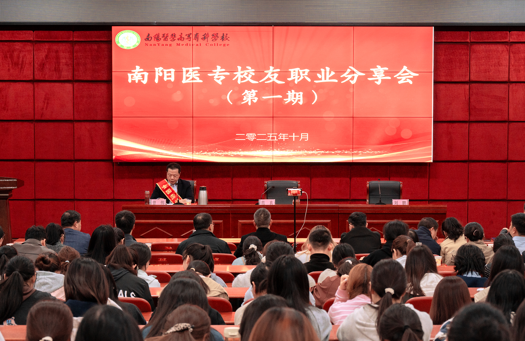 本网讯(文/就业创业处 刘阳)10月15日下午,我校举办校友职业发展分享会。学校1991届毕业生、全国劳动模范曾伟作“基层医者的责任与坚守”主题报告。校长范真出席并致辞,学校相关部门负责同志,师生代表参加。报告会由就业创业处处长刘鹏主持。