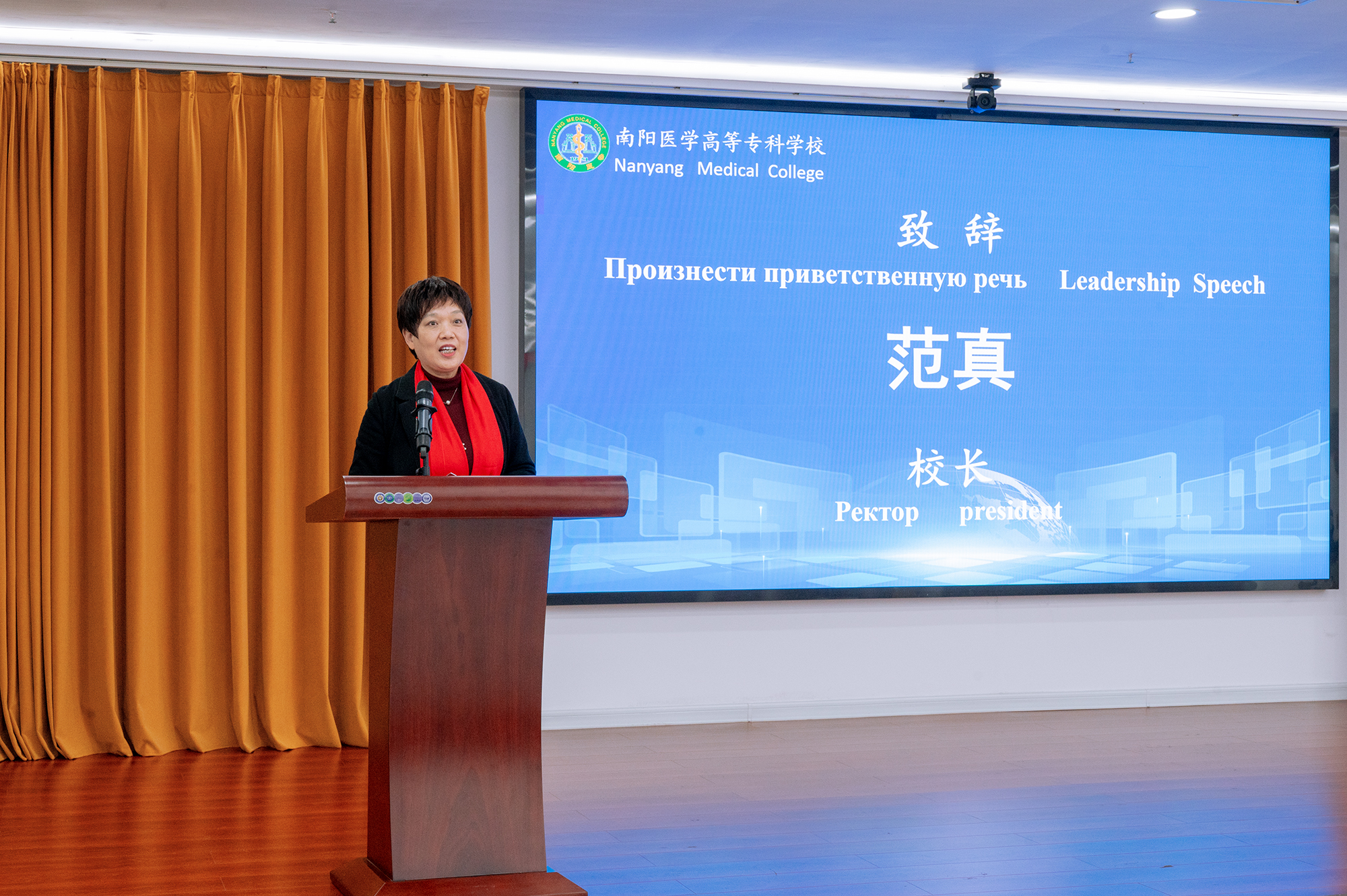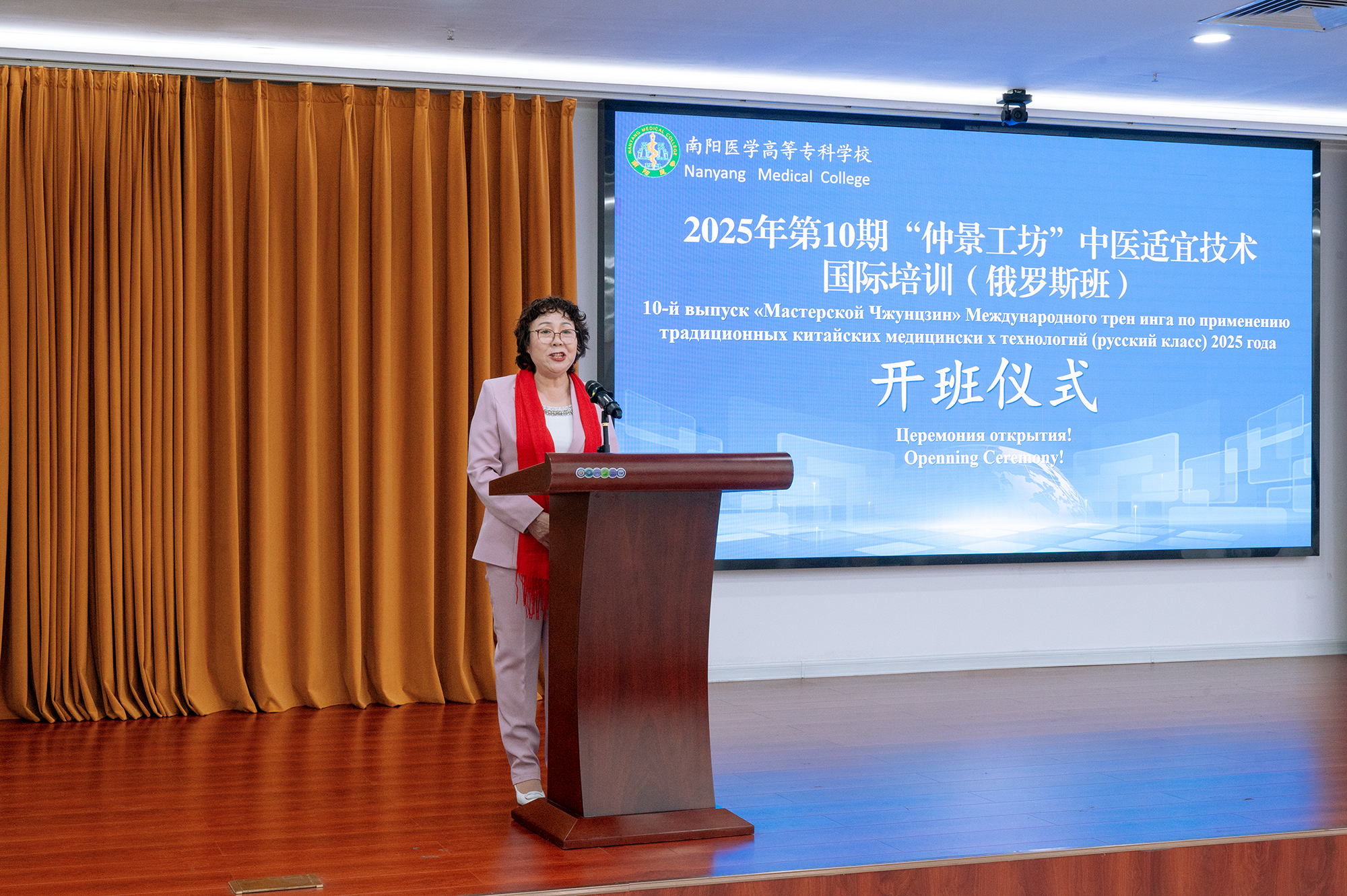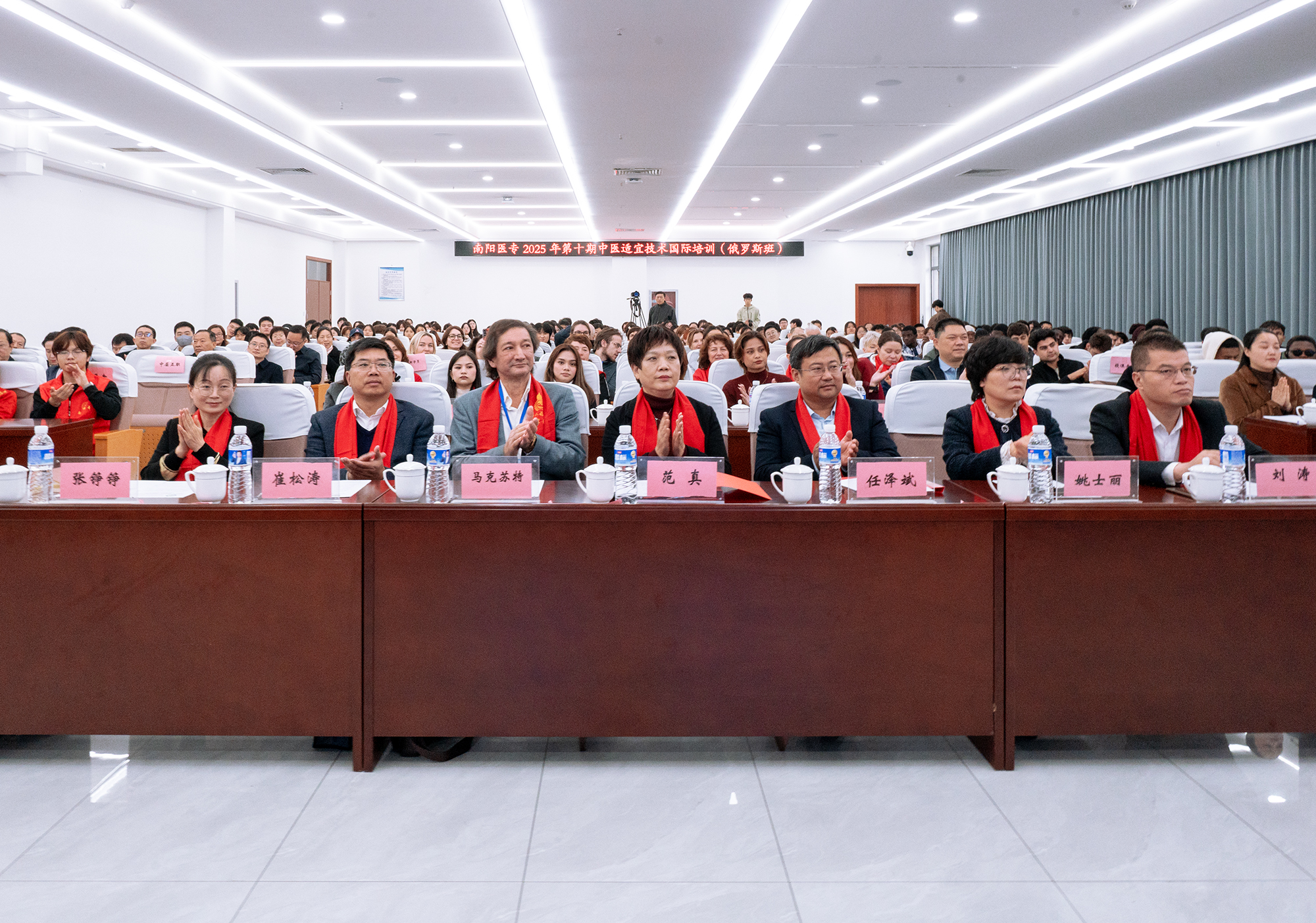 本网讯(文/对外合作交流处 张瑶)10月27日上午,我校举行2025年第10期“仲景工坊”——中医适宜技术国际培训(俄罗斯班)开班仪式。市委办、市商务局、市中医药管理局、张仲景博物院相关负责同志,校长范真及校领导班子成员,俄罗斯中医药学会会长任泽斌、副会长马克苏特,30余名俄罗斯学员代表齐聚现场,共同见证开班时刻,仪式由纪委书记刘金云主持。
