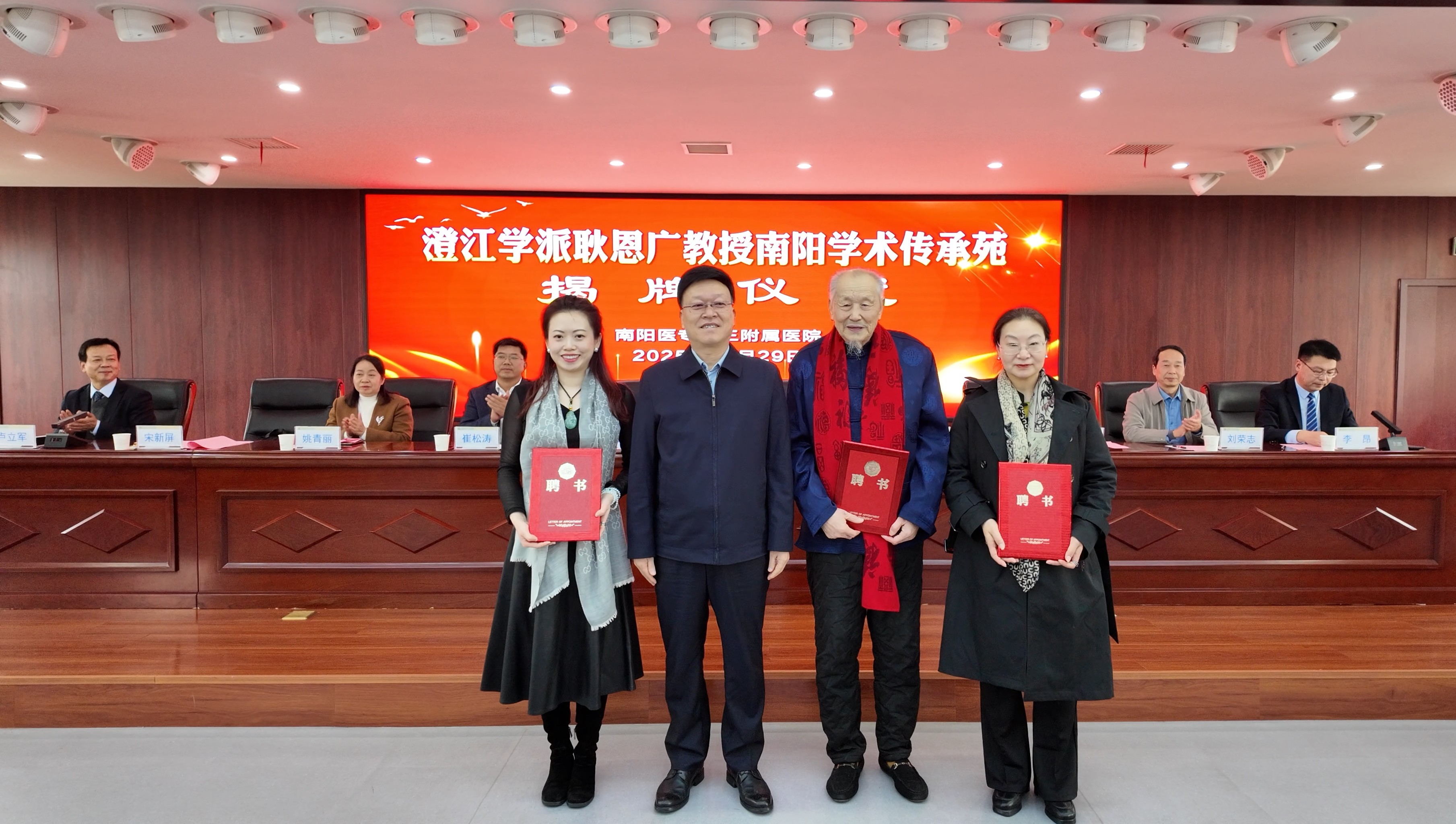 仪式现场,耿恩广、崔松涛、刘荣志、卢立军共同为“耿恩广教授南阳学术传承苑”揭牌。柳明伟代表学校向耿恩广教授及其团队颁发客座教授聘书。