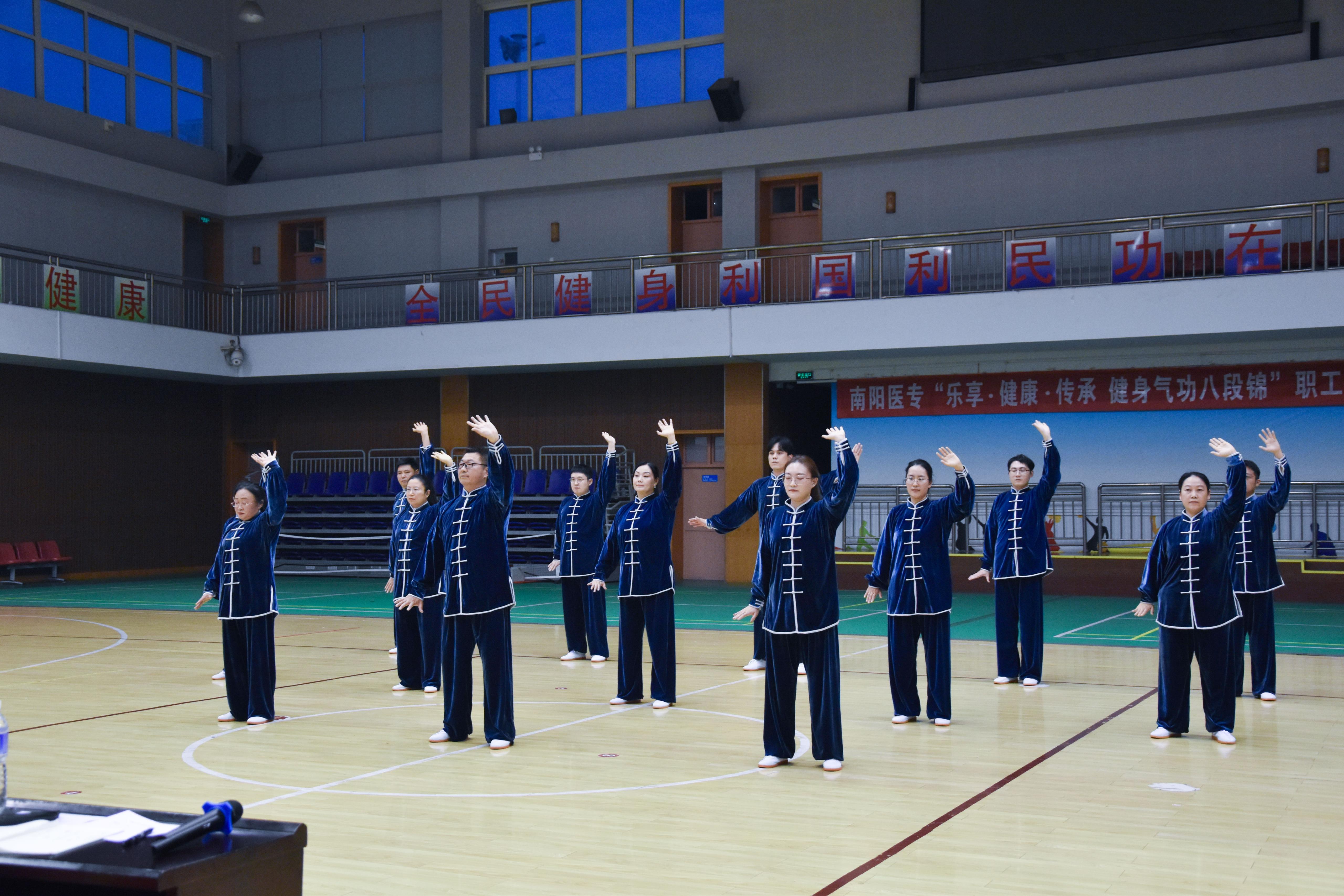 本网讯(文/工会 艾静)为丰富校园文化生活、增强教职工身体素质,传承中华传统养生文化,11月4日,我校举办“乐享·健康·传承”健身气功八段锦职工大赛。 全校11个分工会代表队踊跃参赛,纪委书记刘金云,副校长杜晓平、郭延东、王岩亲临现场,赛场气氛热烈。