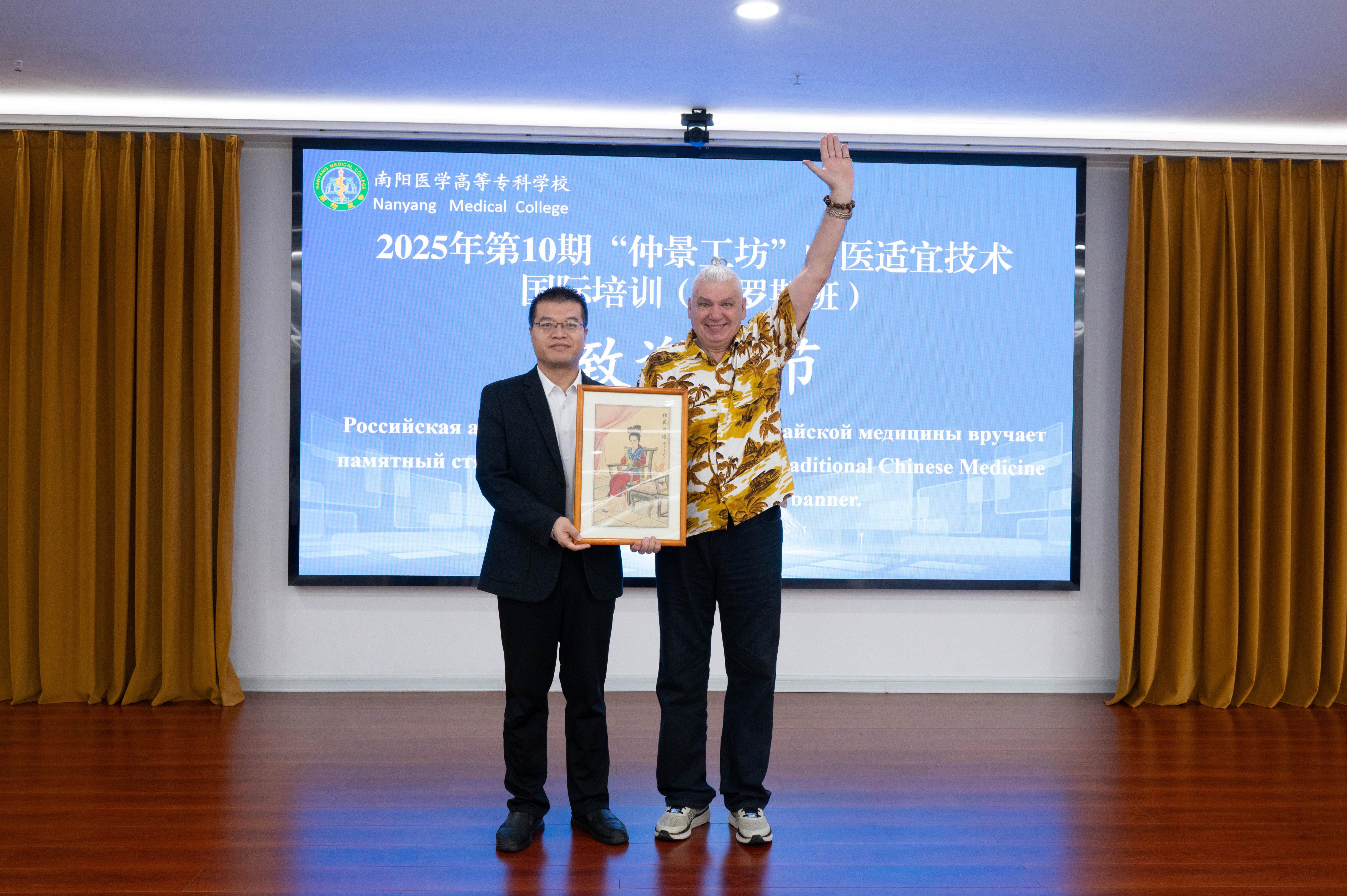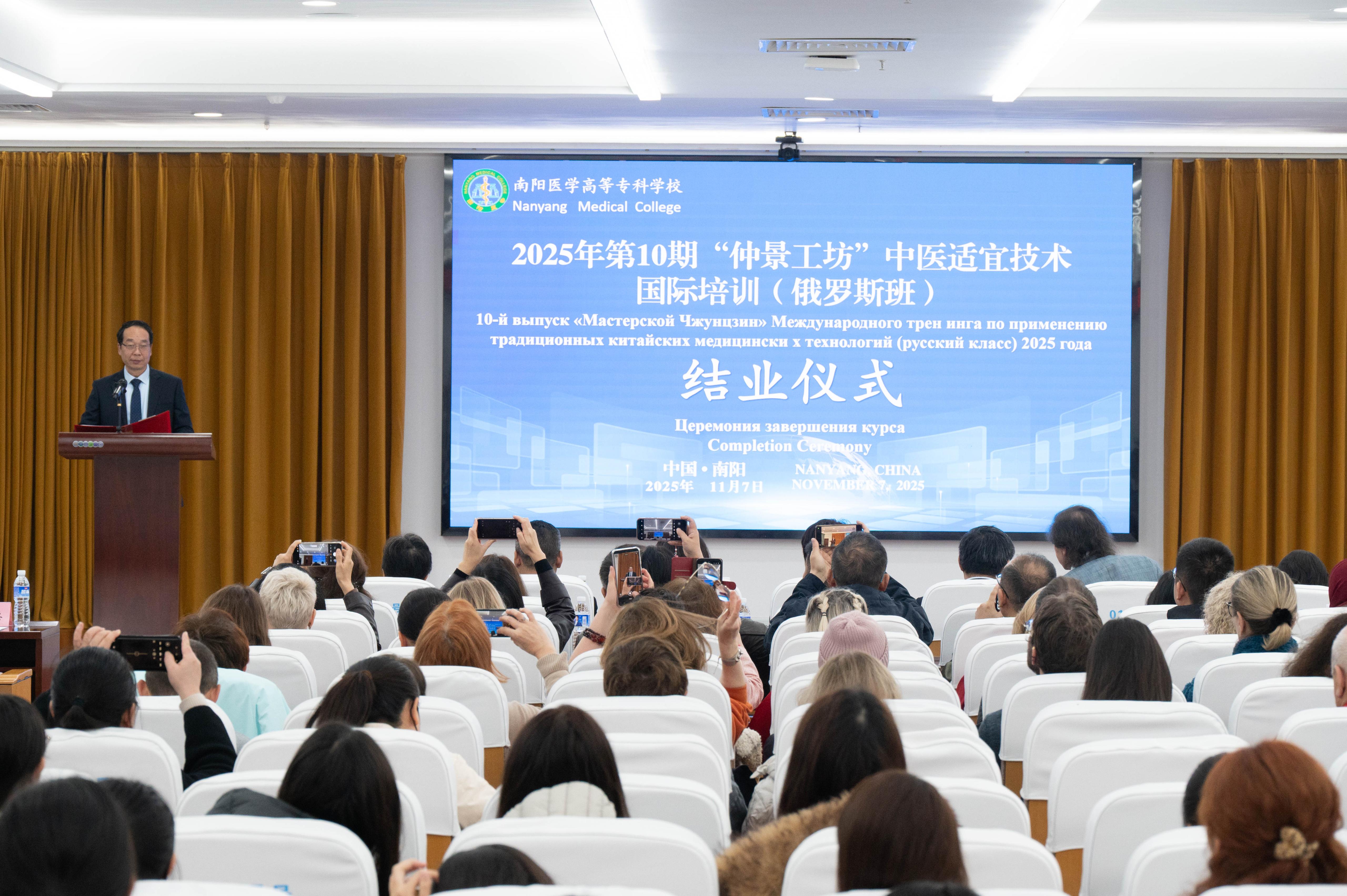 本网讯(文/对外合作交流处 夏灵果)11月7日上午,我校举行2025年第10期“仲景工坊”中医适宜技术国际培训(俄罗斯班)结业仪式。俄罗斯中医药学会会长任泽斌、副会长马克苏特,我校校长范真、党委副书记刘涛出席,来校参加中国职业技术教育大会中医技术技能研讨会的代表,我校外籍教师、来华留学生和师生代表共200余人参加。仪式由副校长刘荣志主持。