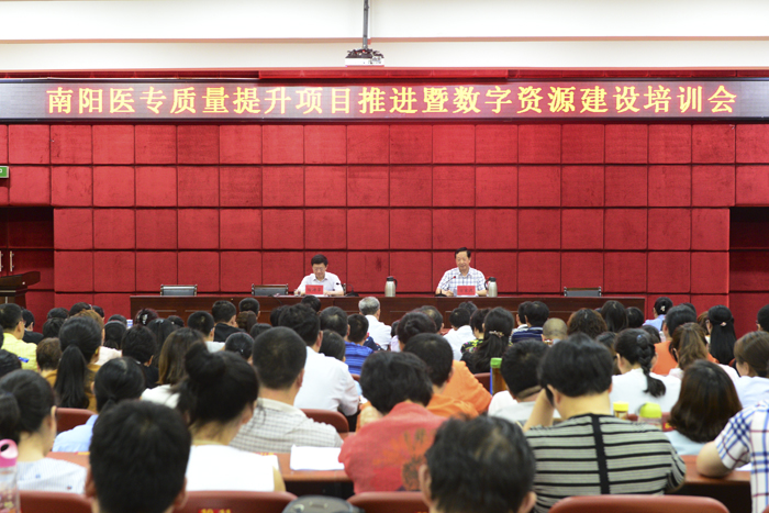 本网讯(文/教务处 张峰)2018年6月20日下午,我校在图书馆五楼召开南阳医专质量提升项目推进暨数字资源建设培训会。校长方家选出席,各项目责任人及主要成员、各系(部、院)主任、副主任、教学办主任、各教研室和实验实训室主任及骨干教师参加了会议。大会由副校长徐持华主持。