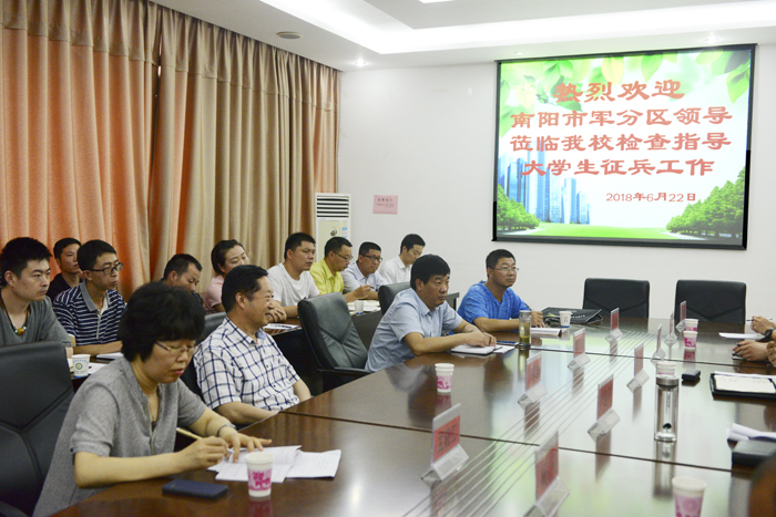 本网讯(文/学生处 余飞海)6月22日上午,南阳军分区领导深入我校检查督导大学生征兵工作进展情况,实地考察了征兵工作站,查阅了相关材料,并召开了座谈会。南阳市委常委、军分区司令员季陵,政委李运斗,动员处处长卢成轶,校领导方家选、郭万周,卧龙区武装部领导杨美、王金宝和我校武装部负责人以及各系院党总支书记、学工办主任、征兵专干参加了座谈会。