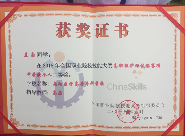 本网讯(文/护理系 李明哲)5月28日至30日,全国职业院校技能大赛(高职组)护理技能赛项在重庆医药高等专科学校举行,本次比赛经过河南省选拔赛共选出5名选手代表河南省参赛,我校王玉和马朝威两名选手参加,王玉同学在比赛中荣获个人全能二等奖,这是我校在教育部组织的全国护理技能大赛中取得的突破性成绩。