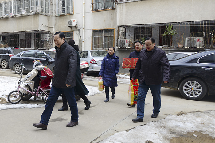 本网讯(文/离退处 艾静)为了弘扬中华民族尊老、敬老、助老的传统美德,2018年新春佳节来临之际,在家的校领导带队,在离退处同志的陪同下,冒着细雨严寒看望慰问了部分老领导、离休干部、生病住院、家庭困难的老同志,向他们送去节日的问候并致以新春的祝福。