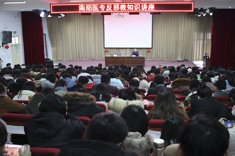 本网讯(文/保卫处 尹广鑫)12月 26日下午,我校在新东区学术报告厅举行了反邪教知识讲座,特邀南阳市委防范办李炳奇科长主讲。学校反邪教协会理事单位,涉学系部书记、学工办主任、全校辅导员以及学生代表450人参加了培训。培训会由理事长牛嵩山主持。