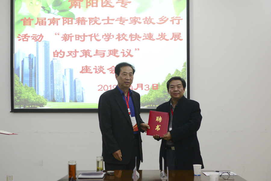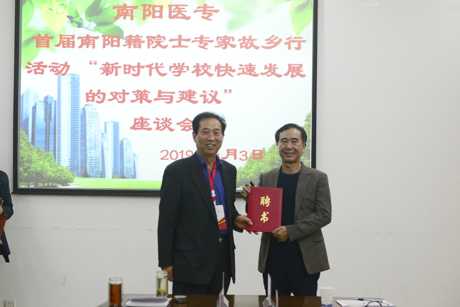 参观结束后,召开了“新时代学校快速发展的对策与建议”座谈会,受邀专家、学校有关领导和相关部门负责人参加,会议由校长方家选主持。校长方家选简要介绍了学校的基本情况。他对各位专家受邀来到南阳医专表示感谢。他说,各位专家都是南阳医专走出去的杰出人才,长期从事医疗科学研究工作,学养丰厚。虽身处他乡,但始终牵挂母校,愿意帮扶、领航、指引学校相关专业建设,是南阳医专发展史上的大事、喜事。专家们就新时代我校如何抓住机遇、突出办学特色、实现学校快速发展、上档升阶出谋划策,为学校下一步发展规划提出了有价值的参考意见。陕西千金方集团公司董事长武圣美当场表示再次向他建立的南阳医专武圣欧基金会拨款300万元,用以支持母校发展建设,奖励品学兼优、有志于中医药学习研究的学生。
