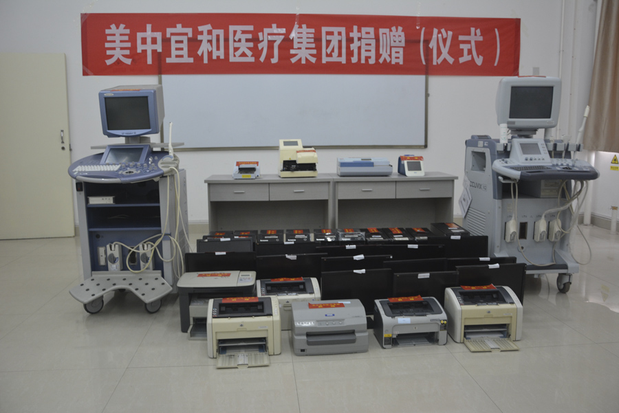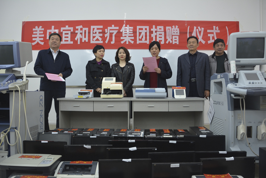 本次北京美中宜和医疗集团向我校捐赠的仪器设备有超声系统诊断仪、检验分析仪、电脑主机、显示器、打印机等,原值达284.6万元。在仪式现场,双方签署了捐赠协议,范真代表学校为美中宜和医疗集团颁发了荣誉证书。