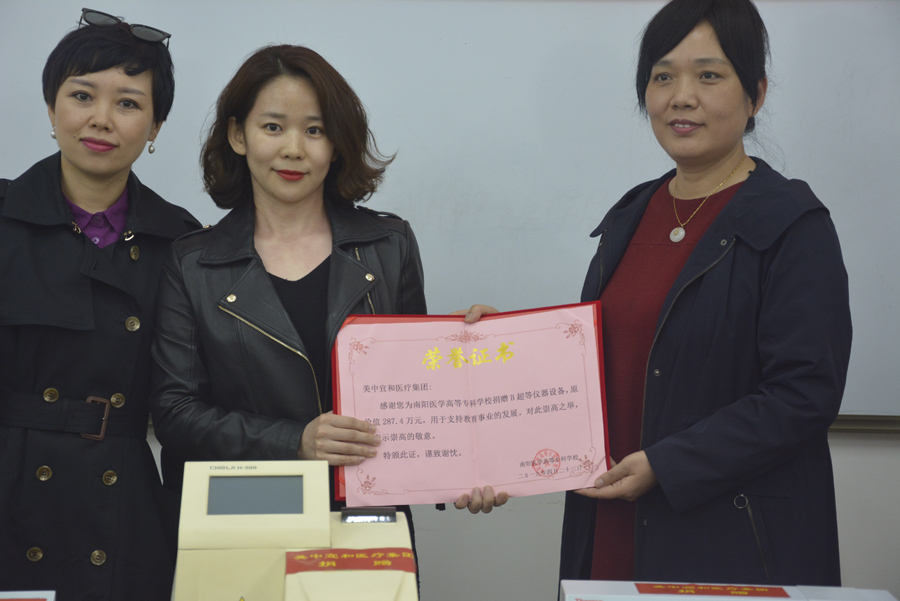 范真致辞,对北京美中宜和医疗集团向我校捐赠助学的善行义举表示感谢。她指出,学校的发展建设得益于社会各界人士的鼎力相助,我校一定会管理好、使用好这些仪器设备,助推学生实践技能的持续提升。她希望社会各界一如既往地关心支持南阳医专的建设发展,加强沟通联系、增进交流合作,实现共建共享。