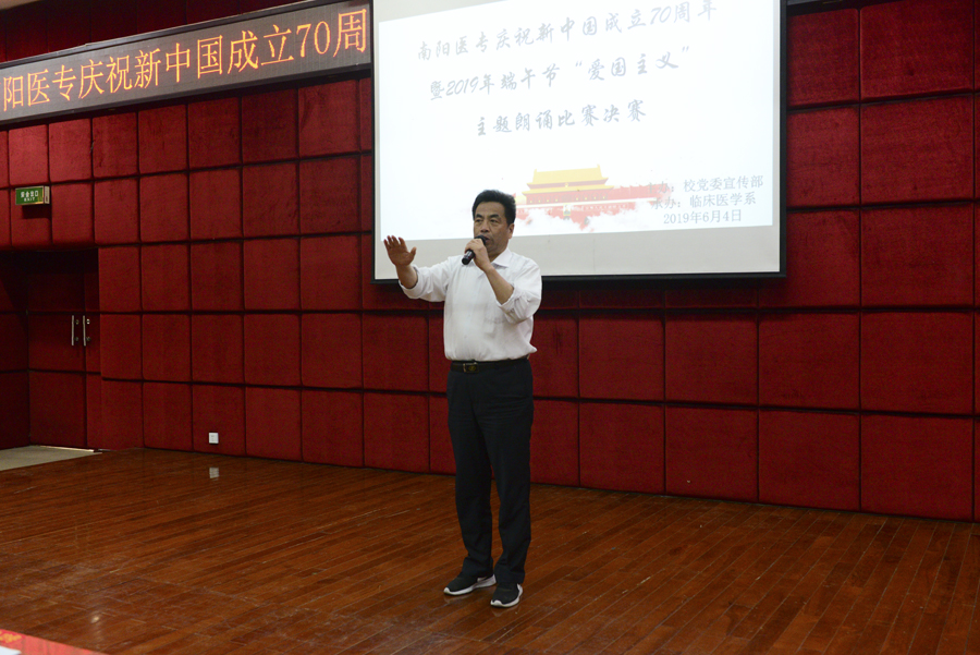 本网讯(文/临床医学系 王静)为深入贯彻落实党的十九大和全国、全省教育大会精神,传承中华优秀传统文化,大力弘扬以爱国主义为核心的民族精神,引导广大师生树立正确的历史观、民族观、文化观,进一步增强文化自信,培养爱国之情,6月4日,我校在图书馆五楼报告厅举办庆祝新中国成立70周年暨2019年端午节“爱国主义”主题朗诵比赛。校党委副书记逵应坤出席活动并致辞;党办副主任王萍、组织部副部长孙超丽、宣传部副部长杨金运、工会女工文体部主任白峰、临床系辅导员刘岩担任比赛评委;各系部院师生300余人观看了比赛。