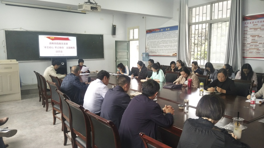 本网讯(文/政教部 雷雨泰)2019年9月18日下午,政教部组织全体党员教师在会议室开展以“不忘初心、牢记使命”主题教育动员会,全体党员教师参加。会议由冯晓青书记主持。