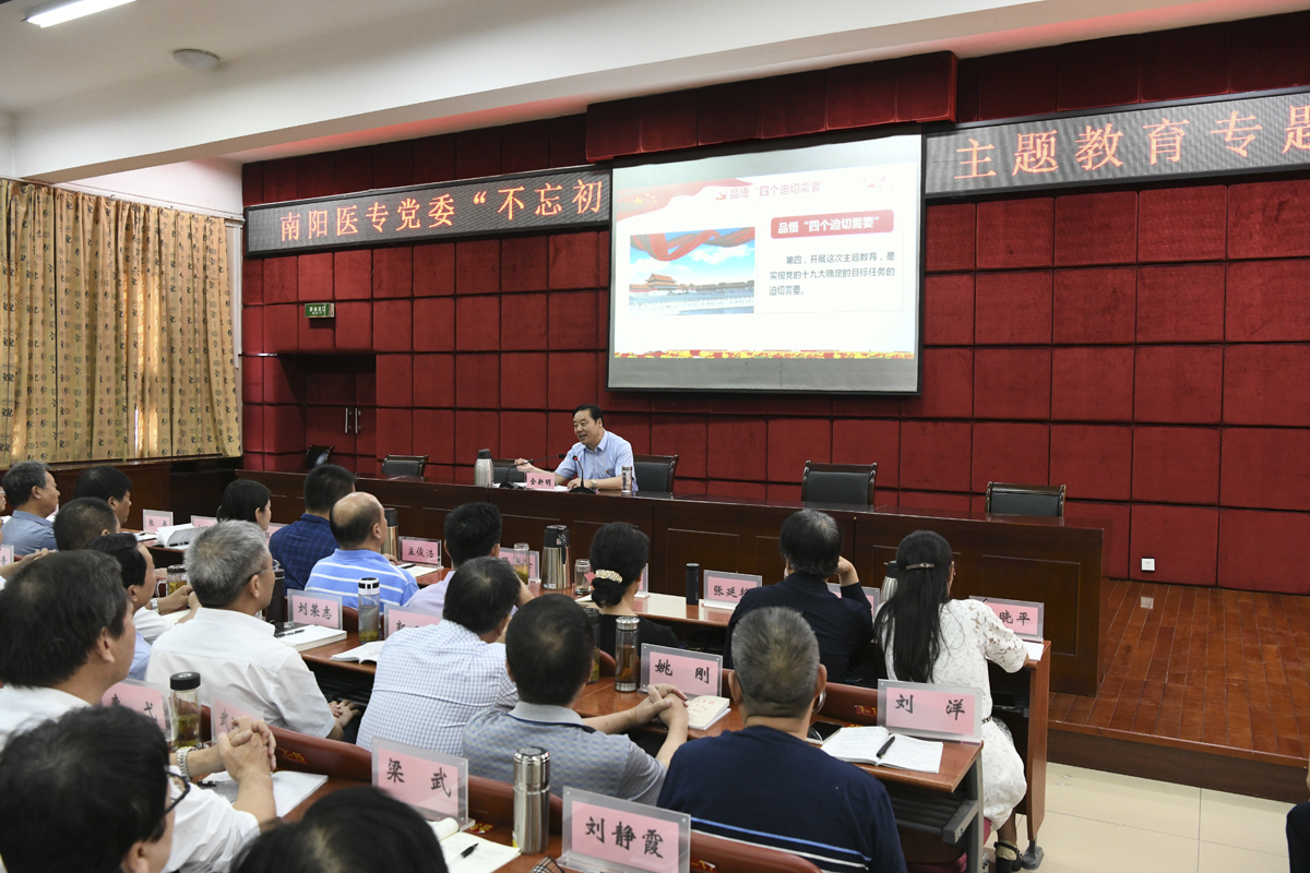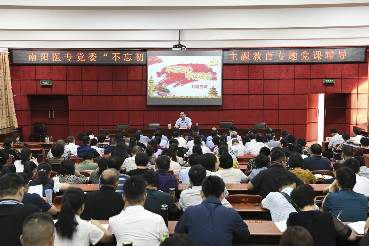 本网讯(文/宣传部 李峰松)9月29日上午,我校在仲景西区图书馆五楼报告厅举办“不忘初心、牢记使命”主题教育专题党课,校党委书记全新明作了题为《 品悟“四个迫切需要”深化对开展主题教育重大意义的认识》的专题党课,南阳市委第十五巡回指导组彭静琳同志、孟俊浩同志出席专题党课,我校在家校领导,校本部副科以上干部(含实验室、教研室主任)、各涉学系(部、院)基层党支部书记、思政课教师、辅导员,三所附属医院分管党务工作的领导参加。