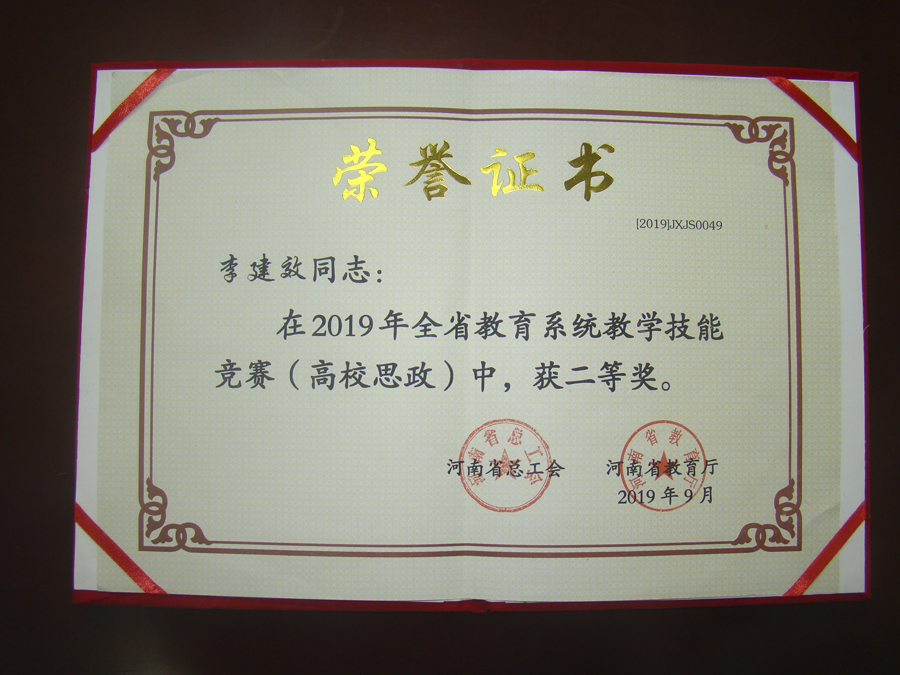 本网讯(文/工会 朱东民)近日,河南省总工会、河南省教育厅联合下发《关于表彰2019年全省教学技能竞赛获奖个人的决定》,我校公共教学部老师白亚蒙荣获高校理科组一等奖,并被授予“河南省教学标兵”,政治理论教学部老师李建效荣获高校思想政治组二等奖。