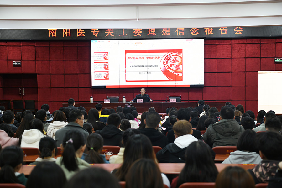 本网讯(文/离退处 朱迪)12月4日下午,我校关工委在仲景西区图书馆五楼报告厅举行理想信念报告会。特邀南阳医专关工委常务副主任、马克思主义哲学教授、原校党委副书记张金虎作报告,国际教育学院副院长范卫杰与近300名学生参加了报告会,报告会由南阳医专关工委秘书长、校离退休职工工作处处长张延艳主持。