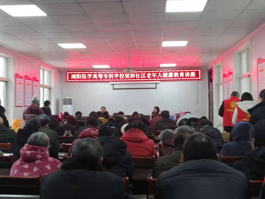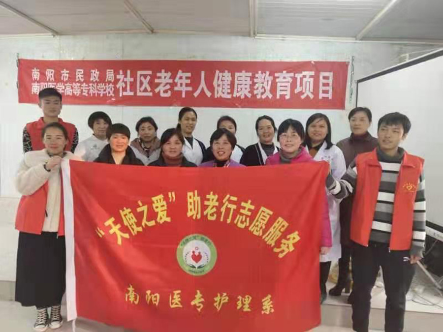 本网讯(文/护理系 李明哲)进入新世纪后,我国人口老龄化速度加快,已成为世界上老年人口最多的国家。近年来,国家相继出台了许多政策和文件,关注社会老龄问题,倡导大力解决老年健康问题,老年人的健康问题被提到了前所未有的位置。为更好满足绝大多数老年人社区居家养老的愿望和需求,提高老年人健康素养,我校顺应国家政策导向、积极适应社会发展需要,主动承担了南阳市民政局社区老年人健康教育项目。