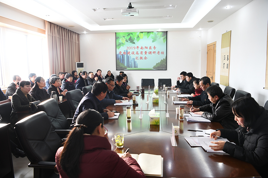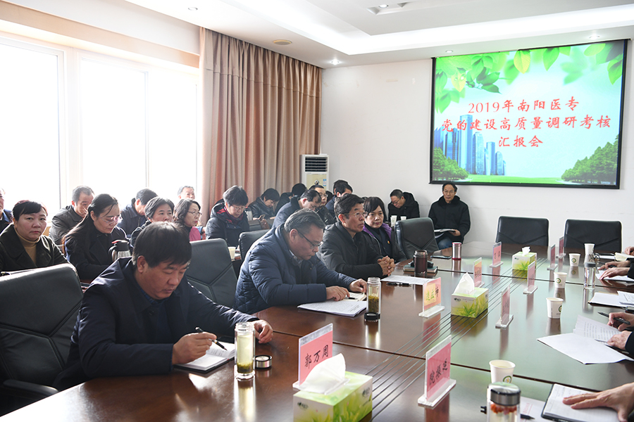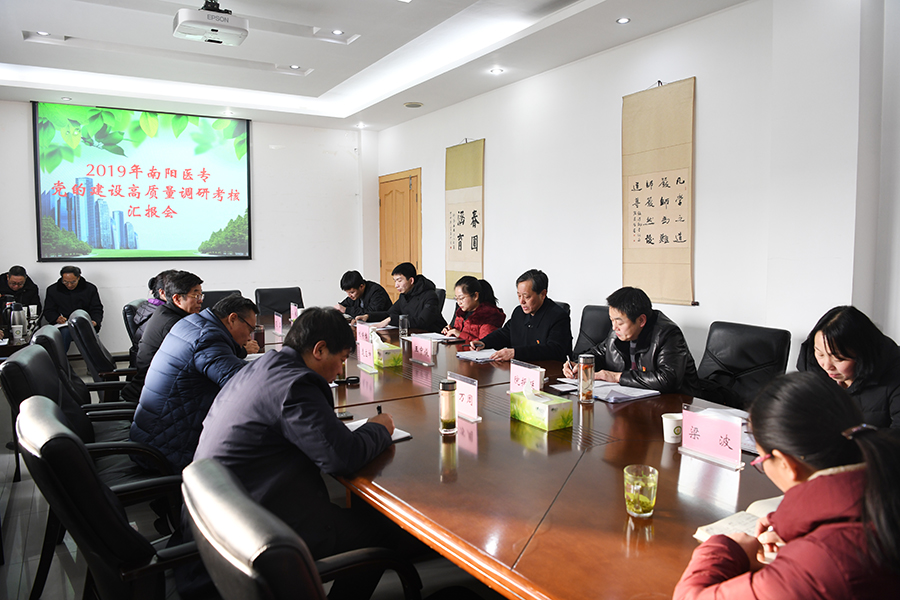 本网讯(文/宣传部 程安琪)按照《2019年南阳市“两个高质量”绩效考核方案》有关要求和市直单位绩效考核工作安排,1月18日,市委第八考核组对我校2019年党的建设高质量进行考核。考核组由市委办公室调研员王中俊、市委专用通信局副局长院振延、市委网信办网络舆情应急科科长刘博雅、市海选联谊会主任科员梁波、市司法局科员王苗苗和宛城区委组织部科员李振6名同志组成。我校党委副书记逵应坤,纪委书记张国良,副校长郭万周、范真及校本部各部门(单位)党、政主要负责人参加会议。会议由纪委书记张国良主持。