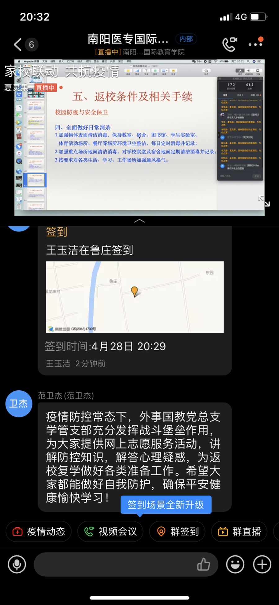 本网讯(文/国际教育学院 夏灵果)外事国教党总支学管支部积极发挥支部引领作用,利用家校育人平台,立足大学生特点,结合工作实际,强化师生教育引导,于2020年4月28日晚利用钉钉平台开展“家校联动,共抗疫情”网上志愿服务主题党日活动。学管支部全体教职工、部分家长和学生代表参加。