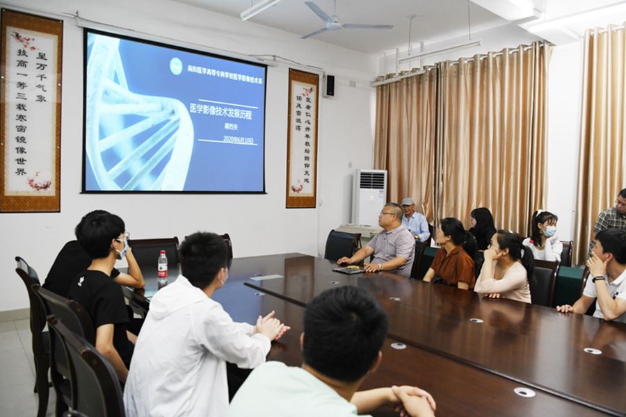 副校长范真和蒋烈夫老师为名医名师工作室揭牌。随后,与会人员实地察看了“蒋烈夫名医名师工作室”运行情况,观摩了蒋烈夫示教带教现场。蒋烈夫主持了专题讲座,就医学影像技术专业发展历程与师生进行了深入探讨。