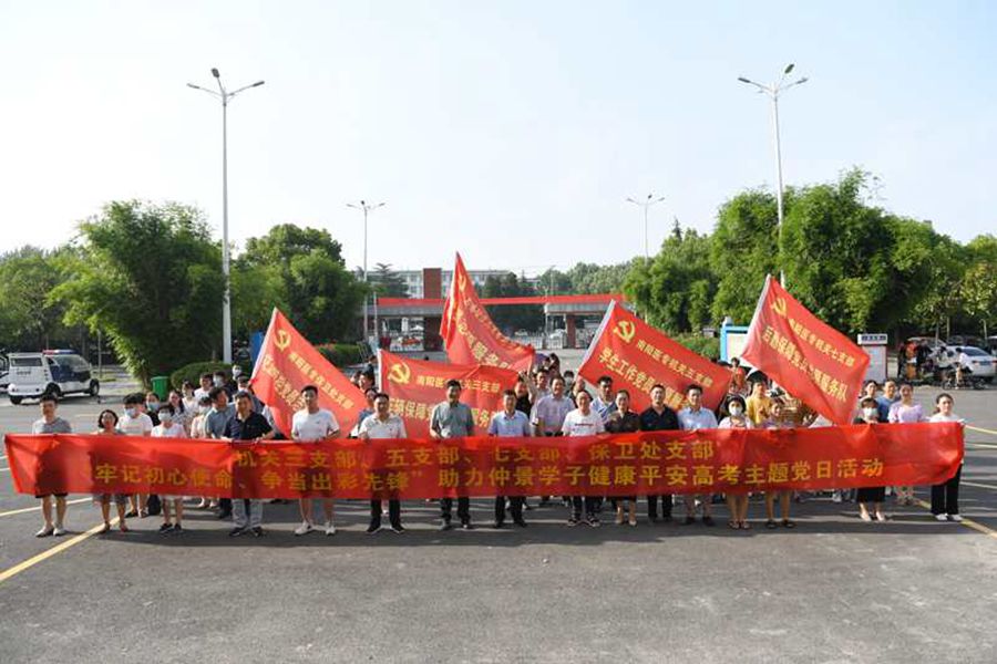 在7月6下午,机关三、五、七支部和保卫处直属支部联合举行“牢记初心使命、争当出彩先锋”主题党日活动启动仪式,党委委员、副校长张国良和郭万周分别为党员志愿服务队、车辆保障党员志愿服务队、后勤保障党员志愿服务队、学生工作党员志愿服务队、交通管控党员志愿服务队授队旗。在这次活动中,68名党员高擎志愿服务队旗,顶烈日,战酷暑,全程跟踪服务,让党旗在助考一线高高飘扬,充分发挥了党员的先进模范作用。(编审 李峰松)