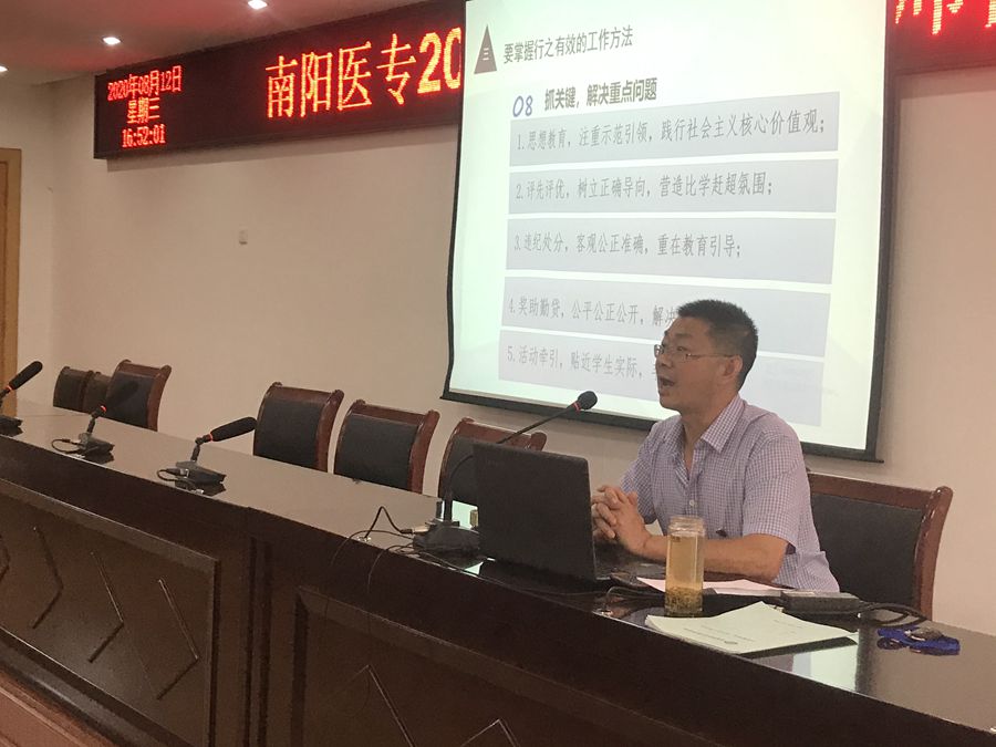 2020年8月11日上午,我校新入职教师岗前培训开班仪式在一号办公楼五楼会议室举行,拉开了整个培训活动的序幕。校党委委员、副校长范真出席开班仪式,医教室主任郭延东、人事处副处长刘洪波、教务处副处长王海鑫和2020年新入职的全体教师参加了开班仪式。开班仪式由教务处处长刘荣志主持。会上,王海鑫副处长宣读了《培训方案》,范校长做了重要讲话。范校长代表学校向全体新进教师顺利进入南阳医专工作和生活表示热烈欢迎。范校长在讲话中语重心长地指出,新入职教师是南阳医专的生力军和新血液,要珍惜此次培训机会,充分认识培训的重要意义,认真向专家学者学,向优秀教师学,向身边榜样学,不断提高教育理论水平和教育实践能力。她还对新入职教师提出了几点希望:一是坚定理想信念。坚定理想信念是年轻教师毕生的必修课。要把自己的人生与党和人民的事业、与自己的岗位职责紧密相连,这样,他所创造的就是永恒的青春。二是脚踏实地。对于青年教师来讲,正确的发展道路只有以正确的思想为指导,脚踏实地的付出实际行动和努力,才能更好地提升自我,从而实现各种价值。三是爱校奋进。希望新入职教师继承历代医专人塑造的光荣传统,也希望大家热爱学校,感恩学校,带着感情在学校工作、生活。最后,刘荣志处长特别强调了培训过程中的管理问题,并预祝老师们学有所成,尽快融入到南阳医专这个大家庭,为学校的高质量发展做出应有的贡献。