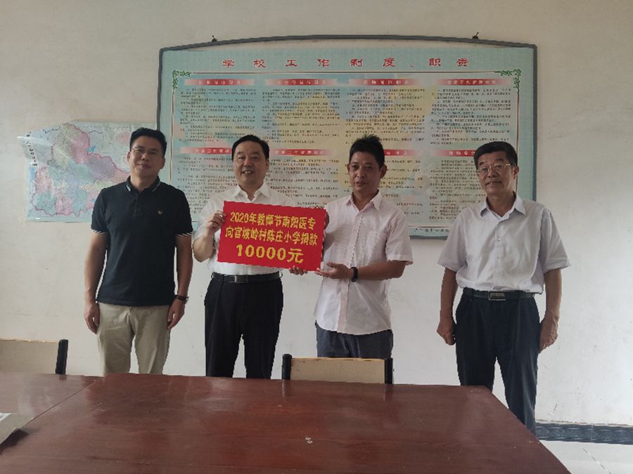 此次慰问,我校为陈庄小学和沙沟寨小学各发慰问金10000元。在陈庄小学,全书记一行听取了学校的基本情况介绍及“南阳医专梦想基金”的使用情况,该校负责人现场赠予我校“杏林植桃李、献爱圆梦想”的锦旗,感谢近年来对陈庄小学的大力支持和帮助。在沙沟寨小学,全书记一行仔细察看了校园环境、现场听取了学校发展情况介绍,深入了解了学校教育教学管理等。在交谈过程中,全书记讲到,南阳医专作为官坡岭村和沙沟寨村的帮扶单位,会充分发挥教育资源优势,将全力支持小学教育的发展,将继续为两所小学在硬件设备、校园基本建设等方面给予支持和帮助。