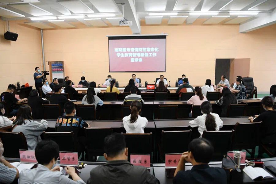 本网讯(文/党办 杨晓兵)9月20日上午,疫情防控常态化学生教育管理服务工作座谈会在南阳医专体育训练馆一楼会议室召开。党委书记全新明,副书记逵应坤,党委委员、副校长张国良、郭万周出席会议;相关部门负责人,系(部、院)负责同志,学生代表(含网格化管理员)参加会议。
