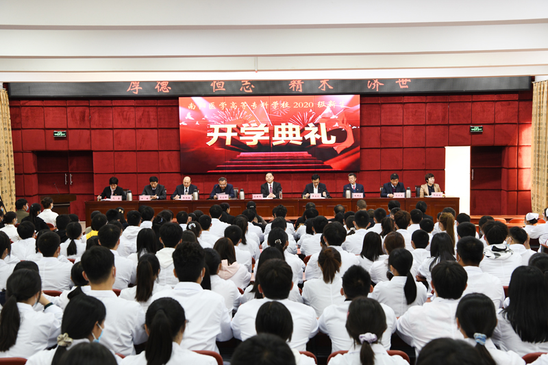 本网讯(文/行政办 毕大鹏)10月21日上午,学校2020级新生开学典礼在仲景西区图书馆5楼报告厅隆重举行。根据新冠肺炎疫情防控的需要,今年的开学典礼采取“主会场+分会场(视频会议)”的形式举行。学校党政班子成员在主会场出席了会议,党委办、行政办、教务处、学生处、涉学系(部、院)的中层正职干部,各涉学系(部、院)的学工办主任和部分新生代表在主会场参加了会议。分会场参会人员为主会场以外各部门(单位)的中层正职和主持工作的副职领导,2020级全体新生。开学典礼由党委副书记、校长王立义同志主持。