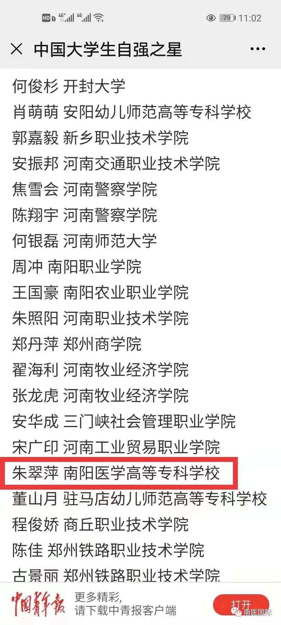 本次“中国大学生自强之星”奖学金推报工作由共青团中央、全国学联指导,中国青年报社、新东方教育科技集团联合开展。活动以“青春自强 刚健勇毅”为主题,重点关注家庭经济贫困学生以及在投身新冠肺炎疫情防控、服务全面建成小康社会、助力乡村振兴、参与社会实践、热心志愿服务、弘扬网上文明等方面有优秀事迹,在当代大学生中能够起到榜样作用的青年学生,为当代青年大学生实现中国梦树立可亲、可敬、可信、可学的身边榜样。本次推报工作采用“全国—省—校”三级体系,经学校团委、河南省团委两级推荐,全国组委会组织专家召开评审会,最终产生10名“中国大学生自强之星标兵”、2190名“中国大学生自强之星”。 河南省共有90名学生荣获“中国大学生自强之星”,我校朱翠萍同学是其中光荣的一员。自2015到2019年,我校学生已连续5年获此殊荣。(编审 杨金运)