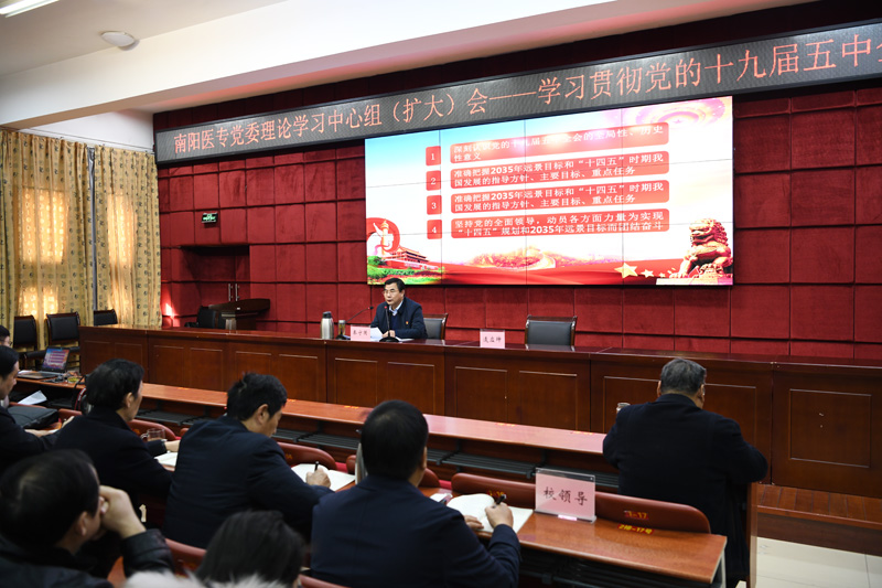 本网讯(文/宣传部 潘晓红)为深入学习贯彻党的十九届五中全会精神,12月16日下午,我校召开党委理论学习中心组(扩大)会议,特邀南阳市委宣讲团成员、市统计局党组书记、局长秦守国作专题辅导报告。校领导班子成员、中层干部、基层党组织委员、政教部专兼职教师、全体辅导员、三所附院书记或院长及分管领导、青马班学生近300人参加了报告会。会议由党委副书记逵应坤主持。