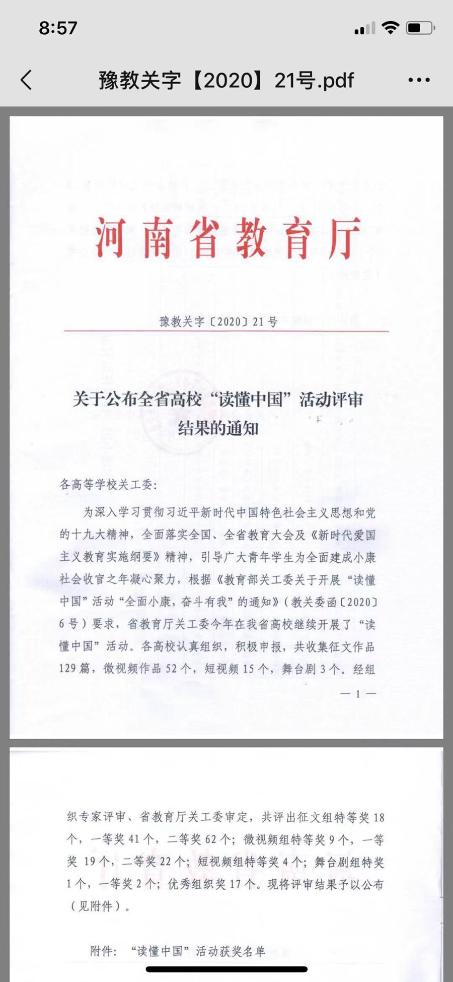 2020年“读懂中国”活动在全省高校全面开展,受到了青年学生、“五老”和学校的广泛欢迎,取得了较好的育人效果,逐步成为高校关工委助力主渠道开展思想政治工作的有效品牌。为深入学习贯彻习近平新时代中国特色社会主义思想和党的十九大精神,全面落实全国、全省教育大会及《新时代爱国主义教育实施纲要》精神,充分发挥“五老”政治优势、经验优势和威望优势,助力高校思想政治工作,引导广大青年学生为全面建成小康社会收官之年凝心聚力,引导青年学生“把灾难当教材,与祖国共成长”,根据《教育部关工委关于开展“读懂中国”活动“全面小康,奋斗有我”的通知》(教关委函〔2020〕 6号)要求,结合河南省教育系统开展“把灾难当教材,与祖国共成长"主题教育活动安排,决定在全省高校组织开展“读懂中国”活动。活动以撰写文章、拍摄微视频、制作短视频、录制舞台剧形式征集高校“五老”先进事迹。