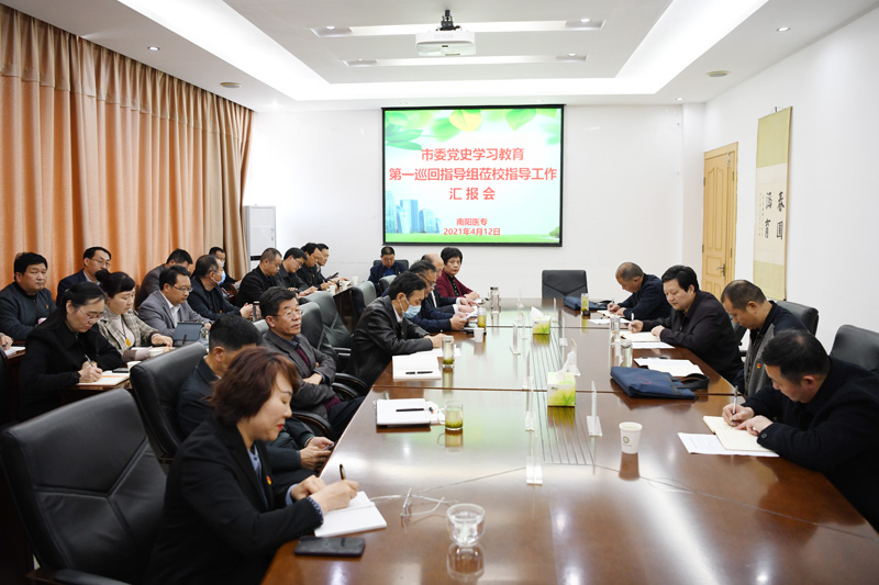 本网讯(文/宣传部 李峰松)4月12日下午,南阳市委党史学习教育第一巡回指导组组长丁济泽、副组长王建军、成员张德东、蒋自豪一行到莅临开展党史学习教育指导调研工作。在家的领导班子成员以及相关处室负责人参加汇报会。副校长张胜海主持汇报会。