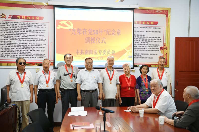 本网讯(文/离退处 艾静)为庆祝中国共产党成立100周年,推进党史学习教育走深走实,进一步增强党员的荣誉感、归属感和使命感,6月22日上午,我校在汉江路离退休职工党员活动室举行“光荣在党50年”纪念章颁授仪式。出席此次会议的有党委副书记逵应坤、“光荣在党50年”纪念章获得者代表、组织部、党委办、宣传部、离退处的同志们。