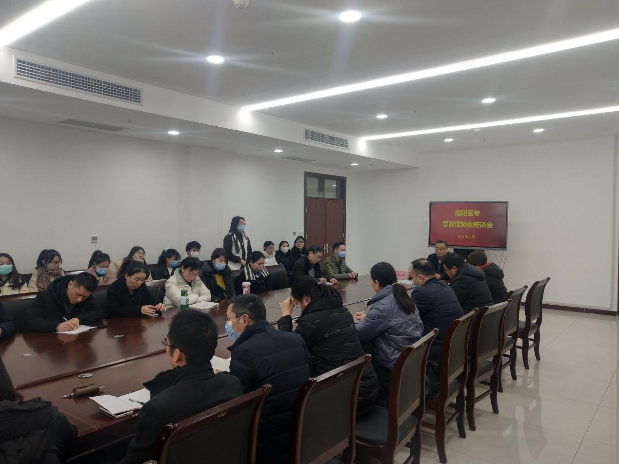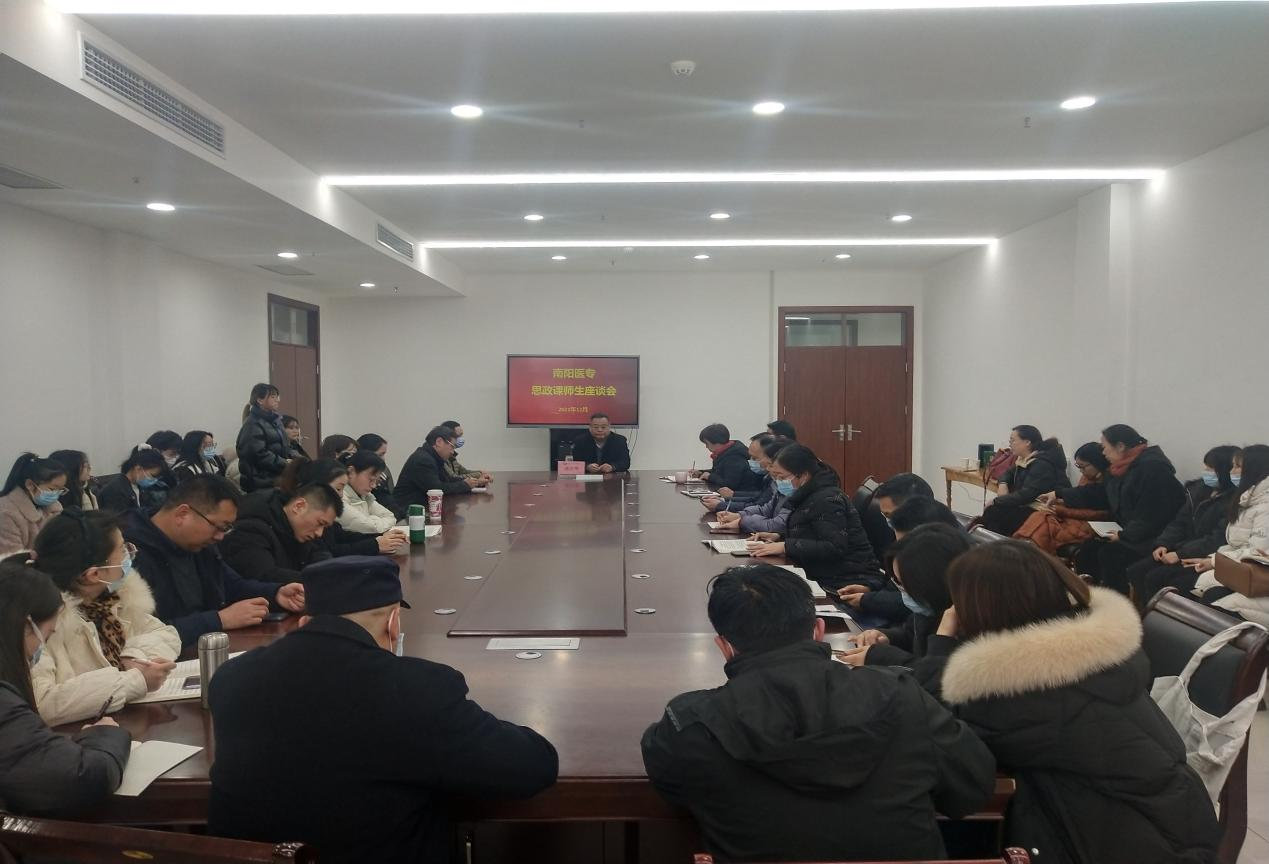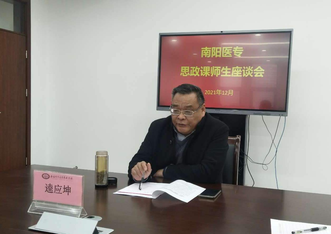 本网讯(文/政教部 李建效)为全面提高我校思政课课堂教学质量,12月15日下午,政教部在仲景文化中心六楼会议室组织召开了思想政治理论课师生座谈会。校党委副书记逵应坤出席座谈会并发表重要讲话,全体思政课教师及学生代表60余人参加座谈会。政教部主任冯晓青主持座谈会。