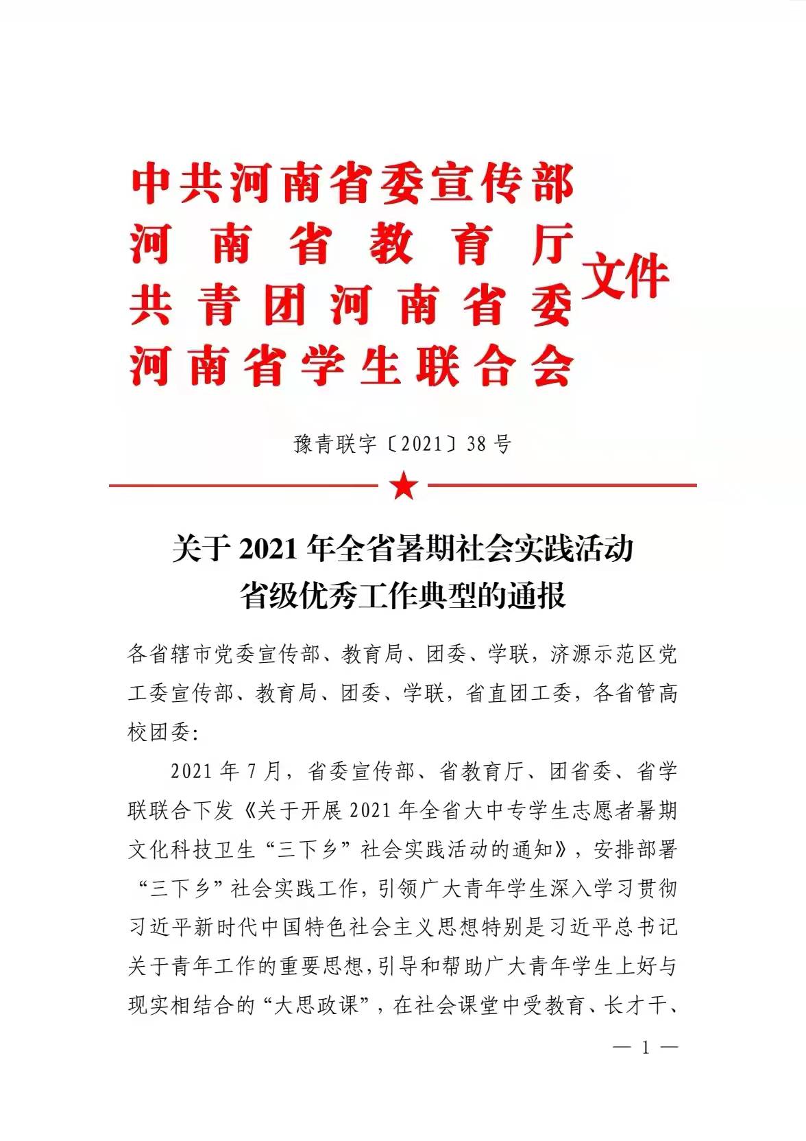 本网讯(文/校团委 古蝉蝉)近日,中共河南省委宣传部、河南省教育厅、共青团河南省委、河南省学生联合会联合发布《关于2021年全省暑期实践活动省级优秀工作典型的通报》,博鱼官方网站,博鱼BOYU(中国)团委被评为“2021年全省暑期社会实践活动优秀单位”,博鱼官方网站,博鱼BOYU(中国)针灸骨伤系志愿者党史学习实践团被评为“2021年全省暑期社会实践活动优秀实践团”。这是对我校社会实践工作的充分肯定与鼓励。