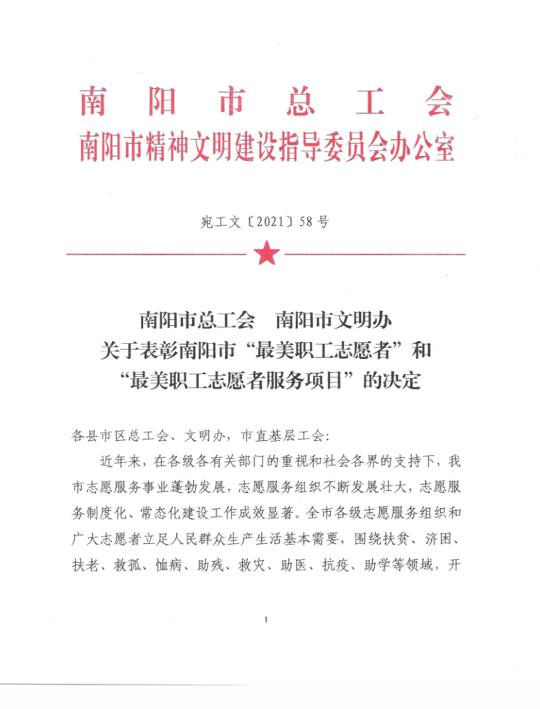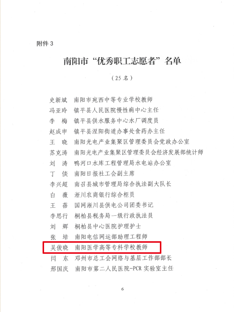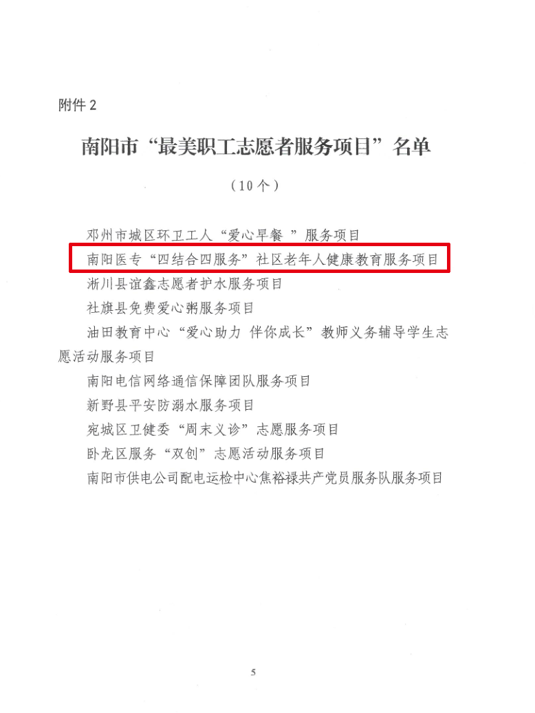 为进一步推动全市志愿服务高质量发展,去年9月,南阳市总工会联合市文明办开展了2021年南阳市“最美职工志愿者”及“最美职工志愿服务项目”选树宣传活动。在校党委的正确领导和校工会的大力支持下,我校护理系与南阳市民政局、南阳市卧龙区合作,发挥专业特色、组织优秀师资团队,持续深入开展了社区老年人健康教育服务。通过采用健康讲座、技能演练、健康保健操、互动游戏、义诊活动等形式,构建“四结合四服务”健康教育新模式,现场讲座114场次,受益人数达6000余人。