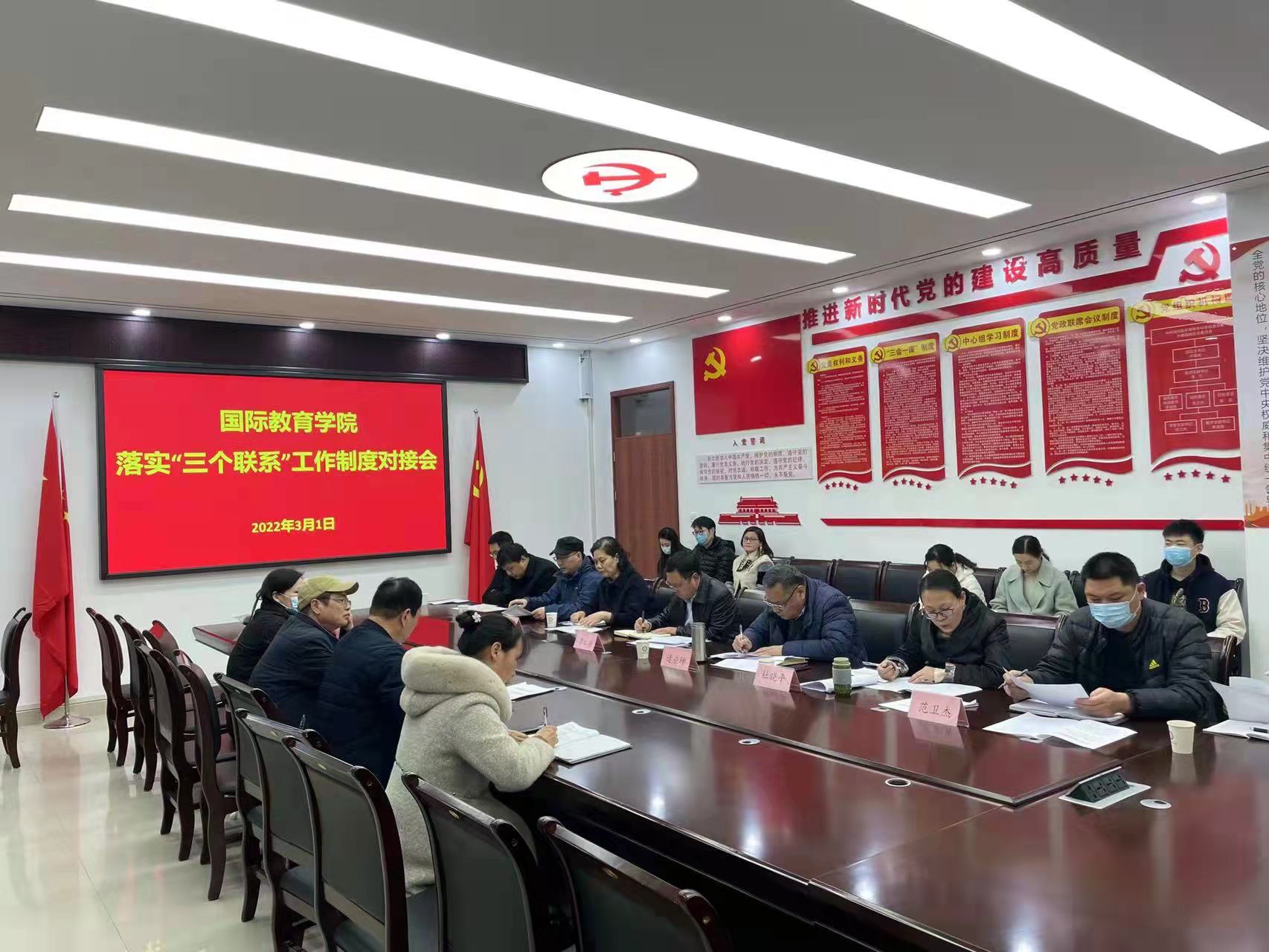 本网讯(文/国际教育学院 李斐)为贯彻落实在全校党政机关领导干部中建立为师生办实事“三个联系”工作制度,推动党史学习教育取得新成效。3月1日下午,校党委副书记逵应坤带领第三工作组领导干部深入国际教育学院就落实“三个联系”工作制度进行对接。外事国教党总支书记卢朝彬主持会议,学院全体辅导员、班主任参加会议。