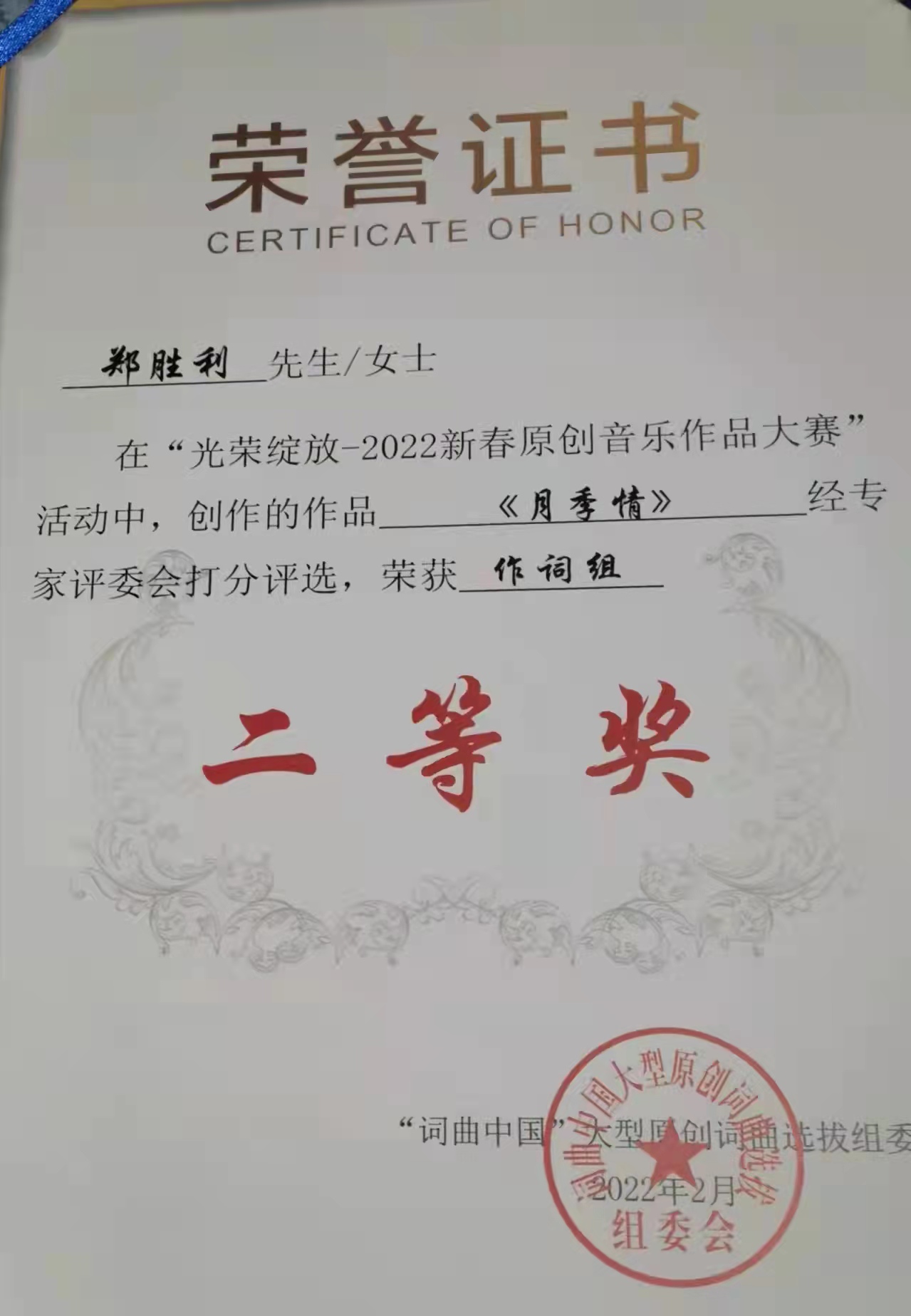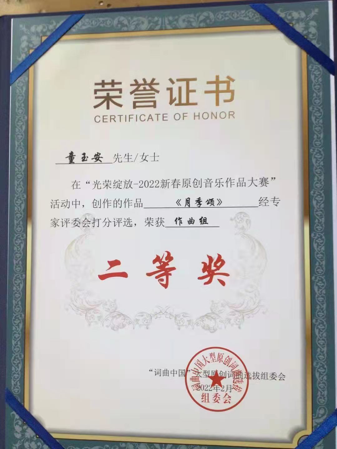 为推出新时代优秀文艺作品,繁荣文艺创作,推动文艺创新,“词曲中国”大型原创词曲选拔组委会联合各文化单位及著名词曲家共同发起此次“光荣绽放2022新春原创音乐作品大赛”活动。据了解,大赛自今年1月初启动以来,全国各地千余名词曲创作者踊跃参与。退休教师童玉安、郑胜利2位同志怀着对大美南阳的深厚情感,用音乐表达心意,以优美舒缓的旋律,诗情画意的歌词,谱写出大美南阳生机无限,为月季花添彩高歌。经过激烈角逐,童玉安老师作曲的《月季颂》,荣获作曲组全国人气评选活动“人气银奖”,经专家评委会打分评选荣获作曲组二等奖;郑胜利老师作词的《月季情》,荣获作词组全国人气评选活动“人气铜奖”,经专家评委会打分荣获二等奖。