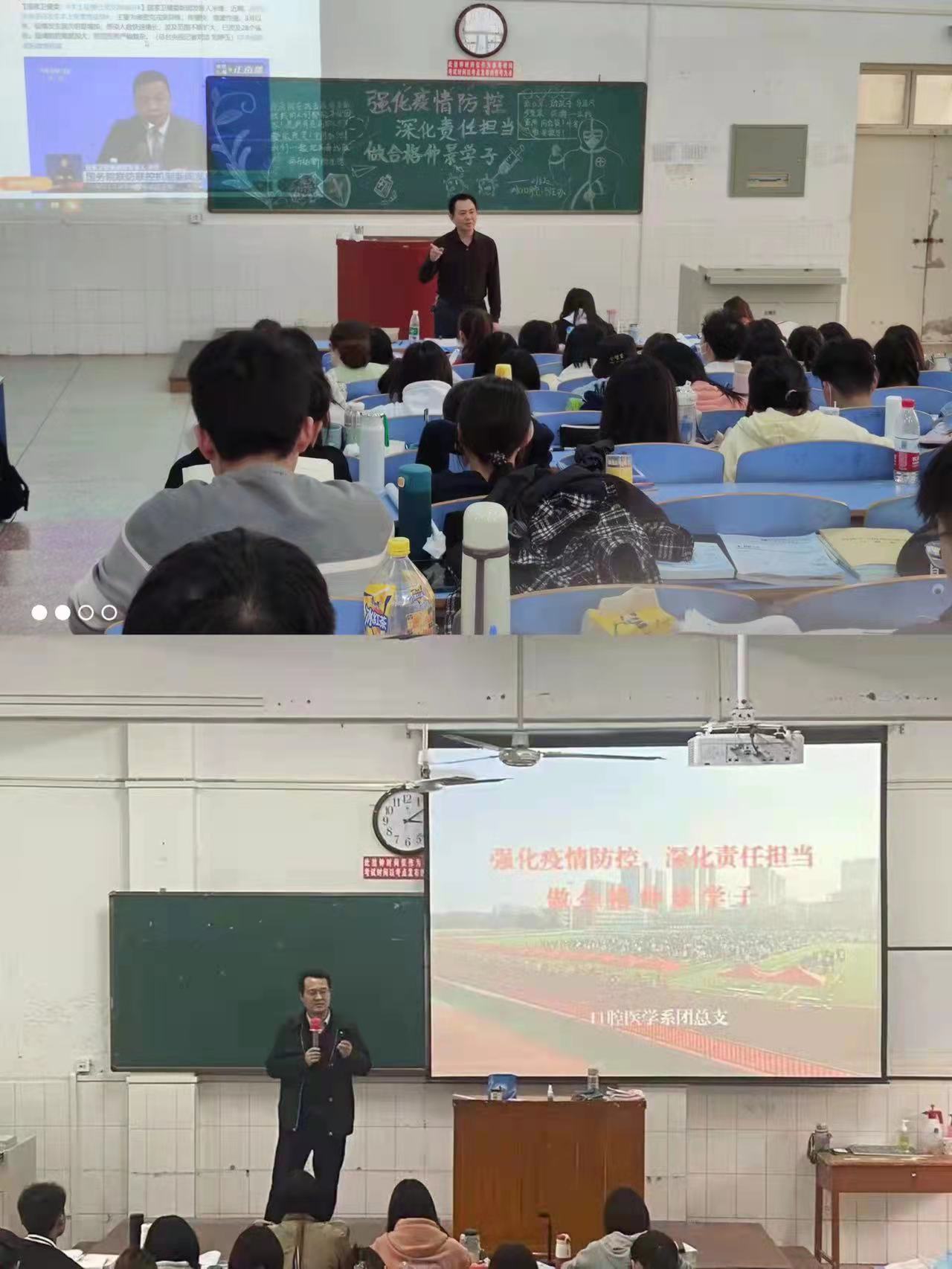 在20级普大口腔2班和21级普大口腔3班,余飞海主持召开主题班会。他与同学们共同学习疫情防控适用的相关的法法规,告诫同学们不可报有松懈心态、厌战情绪和侥幸心理,践行医学生誓言,自觉投身疫情防控,做合格仲景学子。