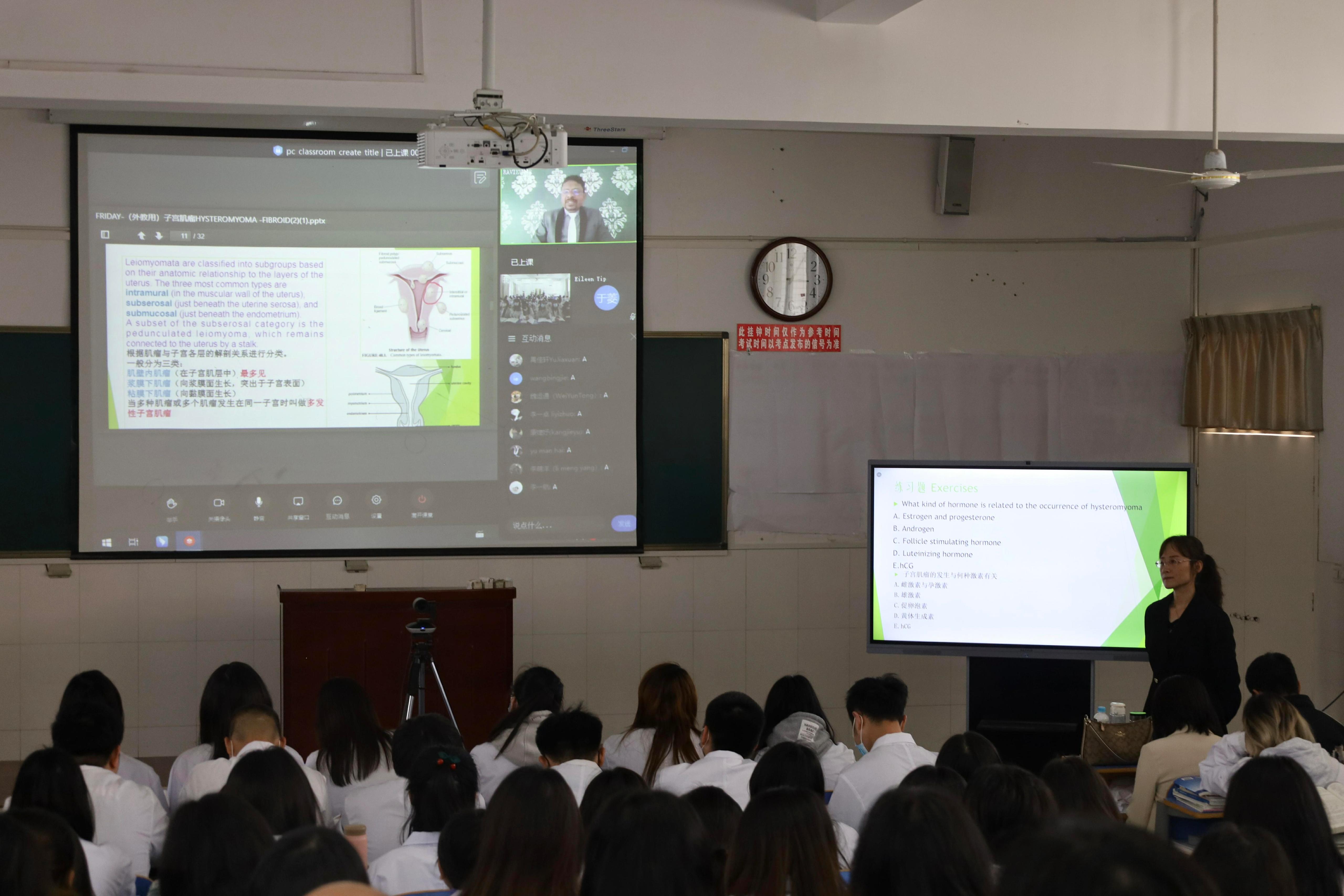 本次课授课主题为《子宫肌瘤》,授课内容由中、美双方教师共同备课,授课时外教Ravi线上进行远程钉钉在线教学,邓琳琳老师线下现场教学。课上,Ravi博士详细讲解了子宫肌瘤的概念、病因、发病机制、分类等内容,外教每讲完一个知识点,邓老师都会适时进行总结引导,对中外教材差异进行对比,加入随堂测试环节,引导学生积极参与课堂,并对本次课临床助理执业医师考试要点进行讲解。