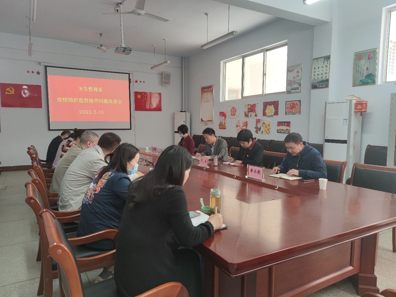 本网讯(文/卫生管理系 李国正)5月15日上午,卫生管理系在仲景西区厚德楼三楼会议室召开疫情防控监督检查问题改进会,校党委委员、副校长范真出席,学校“三个联系”第八工作组,卫生管理系副科以上干部和全体辅导员、班主任参加会议。会议由卫生管理系主任黄永毅主持。