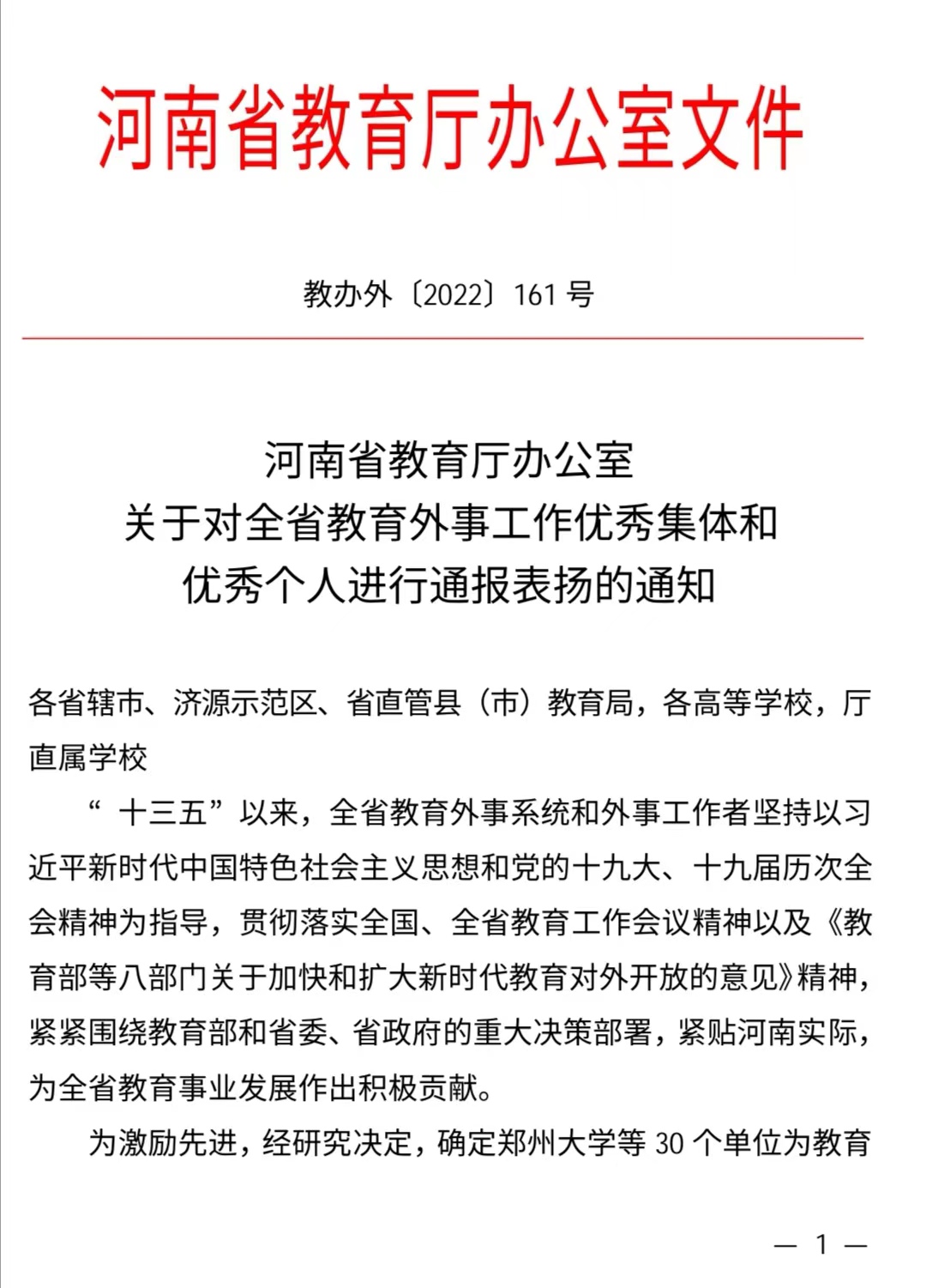 本网讯(文/外事处 范卫杰 周国军)日前,从河南省教育厅传来好消息,我校被评为“河南省教育外事工作优秀集体”荣誉称号,对外交流合作处周国军同志获“河南省教育外事工作优秀个人”荣誉称号。
