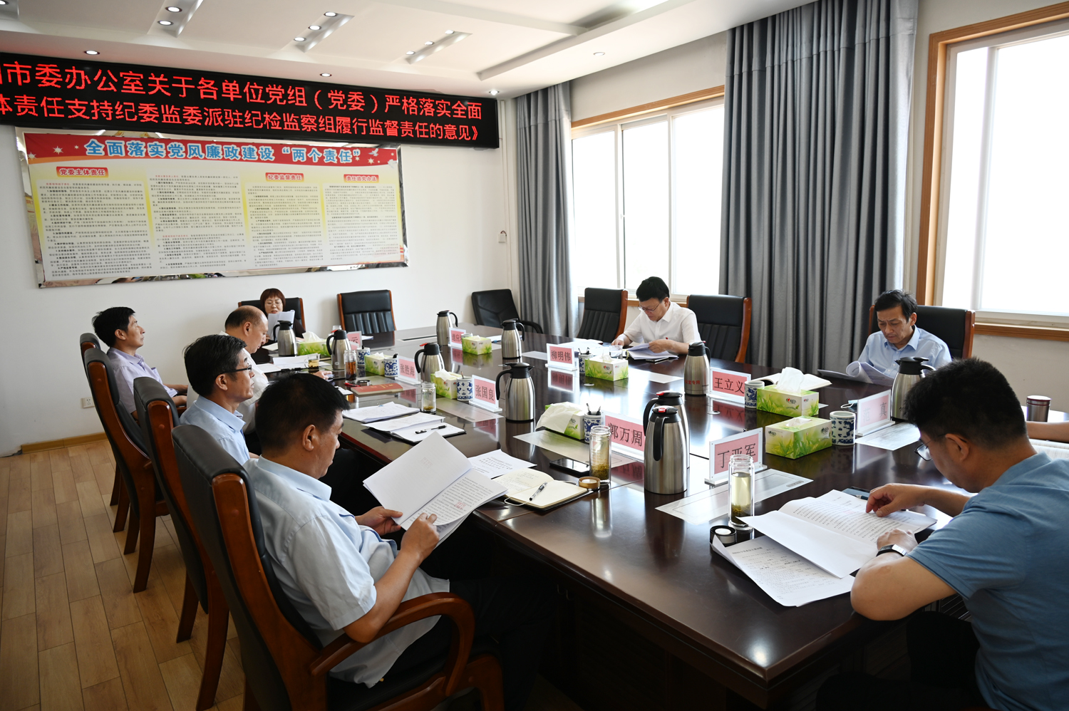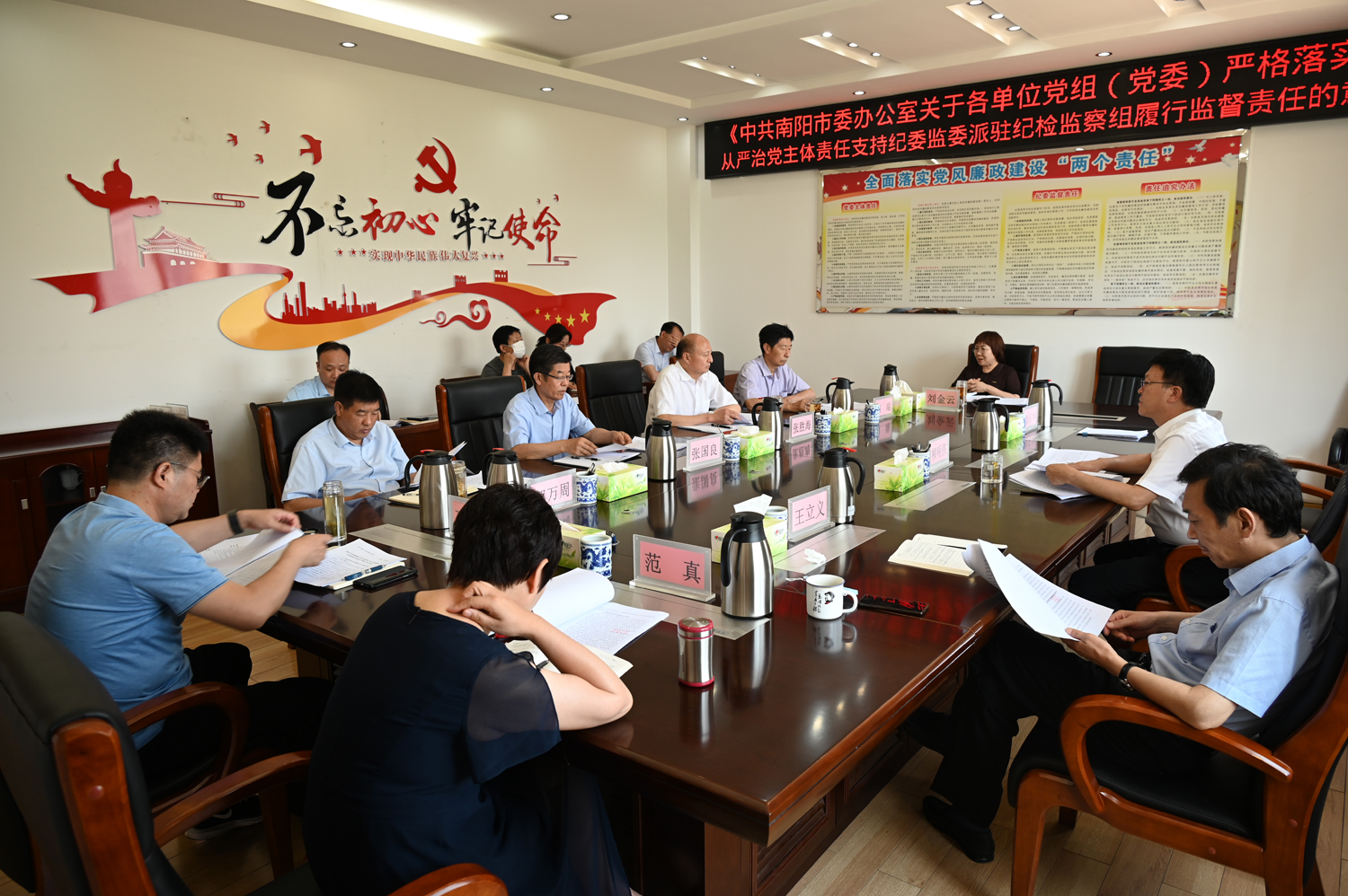本网讯(文/宣传部 潘晓红)6月16日上午,学校党委理论学习中心组召开会议,专题学习《中共南阳市委办公室关于各单位党组(党委)严格落实全面从严治党主体责任支持纪委监委派驻纪检监察组履行监督责任的意见》,党委理论学习中心组成员、相关部门负责人参加会议。会议由校党委书记柳明伟主持。