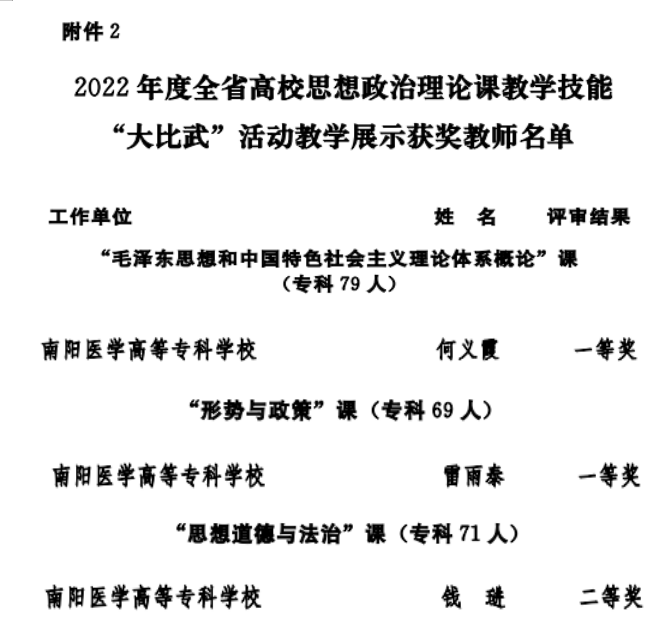 本网讯(文/马克思主义学院 冯晓青)近日,省委宣传部、省委教育工委、省教育厅公布了2022年度全省高校思政课教学技能“大比武”活动的评选结果(豫教工委[2022]84号文件),我校马克思主义学院何义霞、雷雨泰两位教师每人荣获“大比武”活动“综合素质”和“教学展示”两项一等奖,钱琎老师获得“综合素质”三等奖、“教学展示”二等奖。