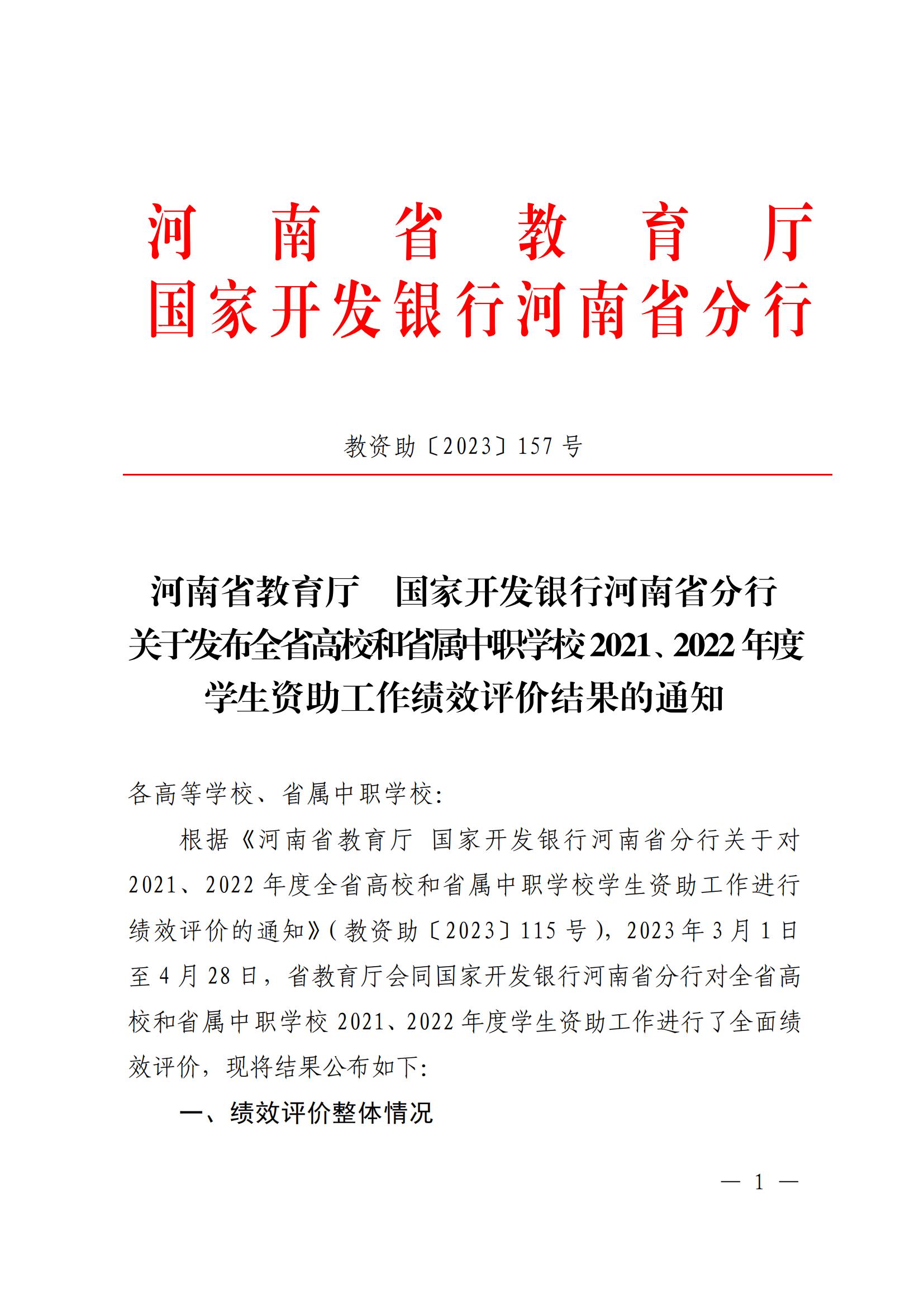 根据《河南省教育厅 国家开发银行河南省分行关于对2021、2022年度全省高校和省属中职学校学生资助工作进行绩效评价的通知》(教资助〔2023〕115号)要求,本次绩效评价工作从3月1日开始,至4月28日结束,分为学校自评、专家组复评和实地复核三个阶段,考核内容涵盖了基础保障、日常管理、管理绩效、附加评价等方面的49个指标体系,省教育厅会同国家开发银行河南省分行成立十个高校学生资助工作专家组,对全省155所高校2021、2022年度学生资助工作进行了全面绩效评价,分别对各高校提交的自评材料进行了集中复评、实地复核。本次共评选出优秀37所,良好68所,合格35所,不合格15所,我校荣获优秀等次,彰显了了我校高质量资助育人成果。